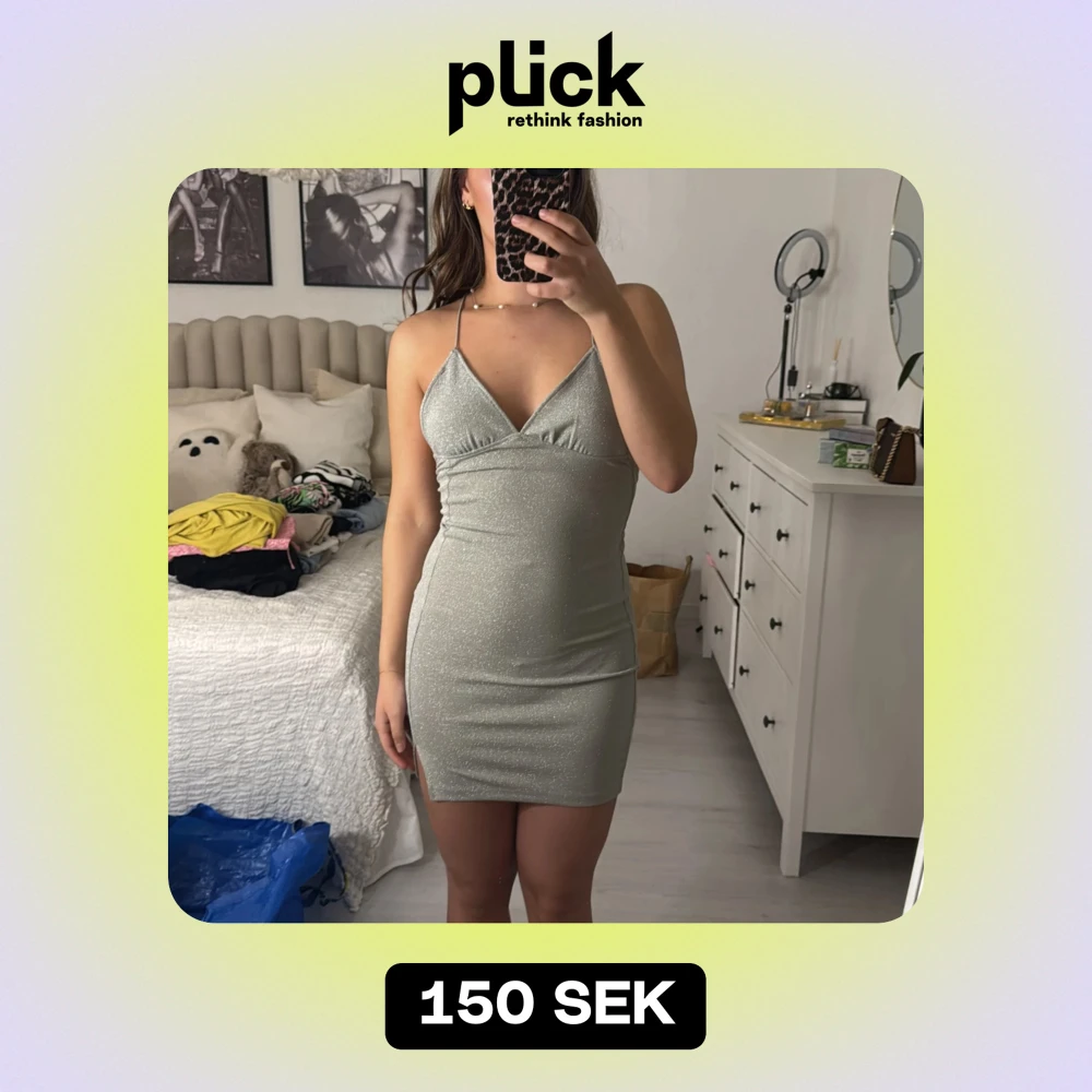 Snygg glittrig silverklänning med smala axelband och v-ringning. Perfekt för festliga tillfällen! Klänningen är tight och kort, vilket ger en elegant och stilren look. Materialet är stretchigt och bekvämt att bära.