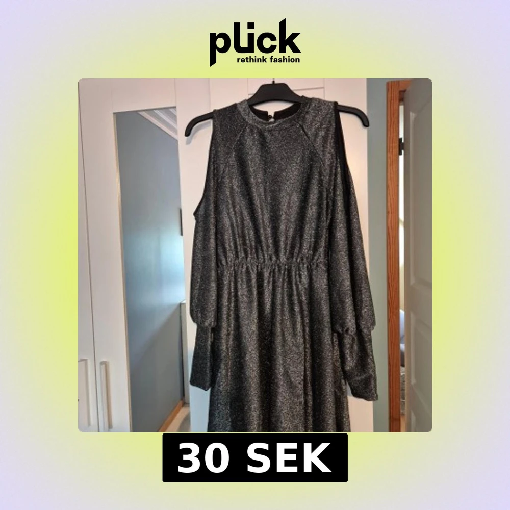 Supersnygg svart glittrig kortklänning med markerad midja och långa ärmar med trendiga cut out-detaljer på axlarna. Klänningen har rund halsringning och ett lätt glansigt material som verkligen sticker ut. Perfekt för dig som vill ha en cool och festlig look.