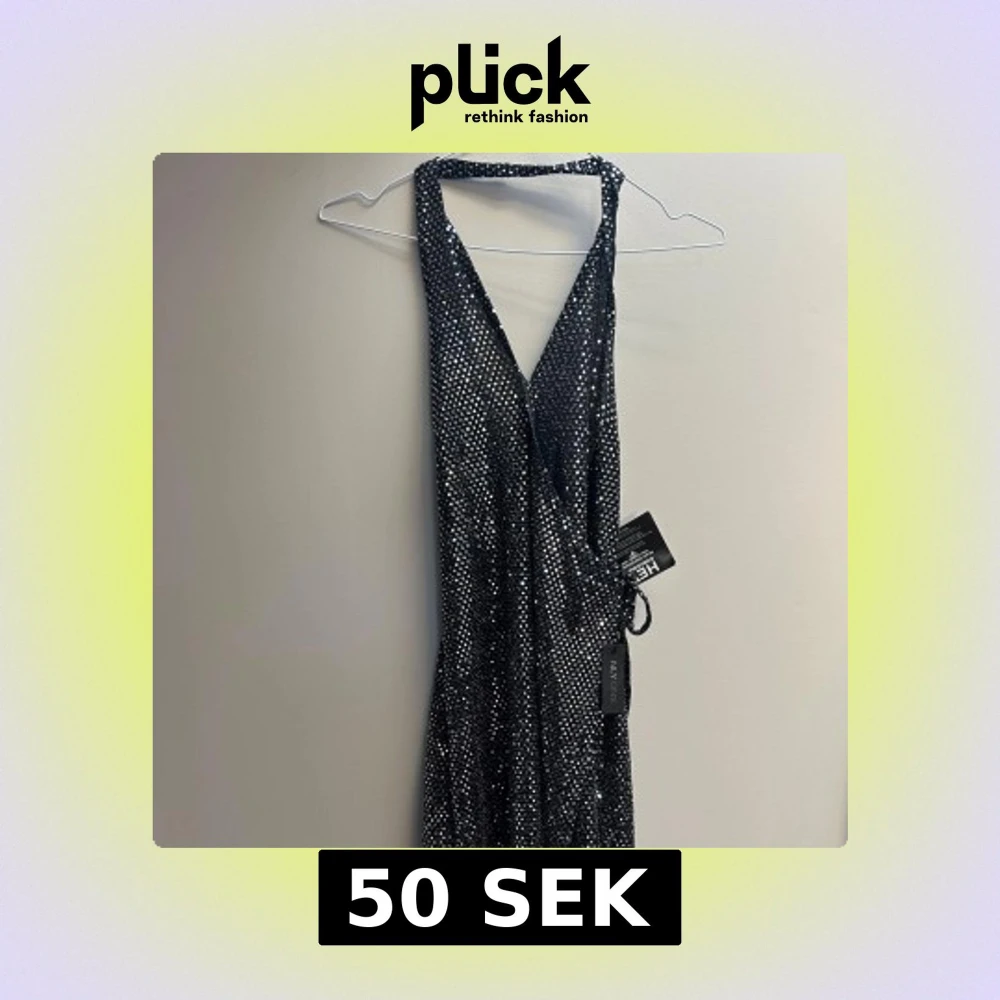 Supersnygg svart långklänning från Nelly med massor av glittriga paljetter. Djup v-ringning och omlott-design framtill. Perfekt för dig som vill sticka ut på festen! Klänningen har ärmlös halterneck och markerad midja.