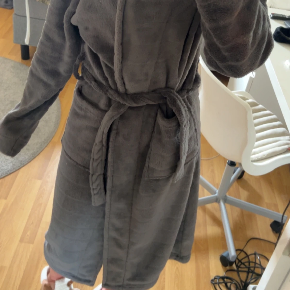 Mysig och mjuk mörkgrå morgonrock i syntetmaterial med knytskärp i midjan och stora fickor framtill. Perfekt för att hålla sig varm hemma.
