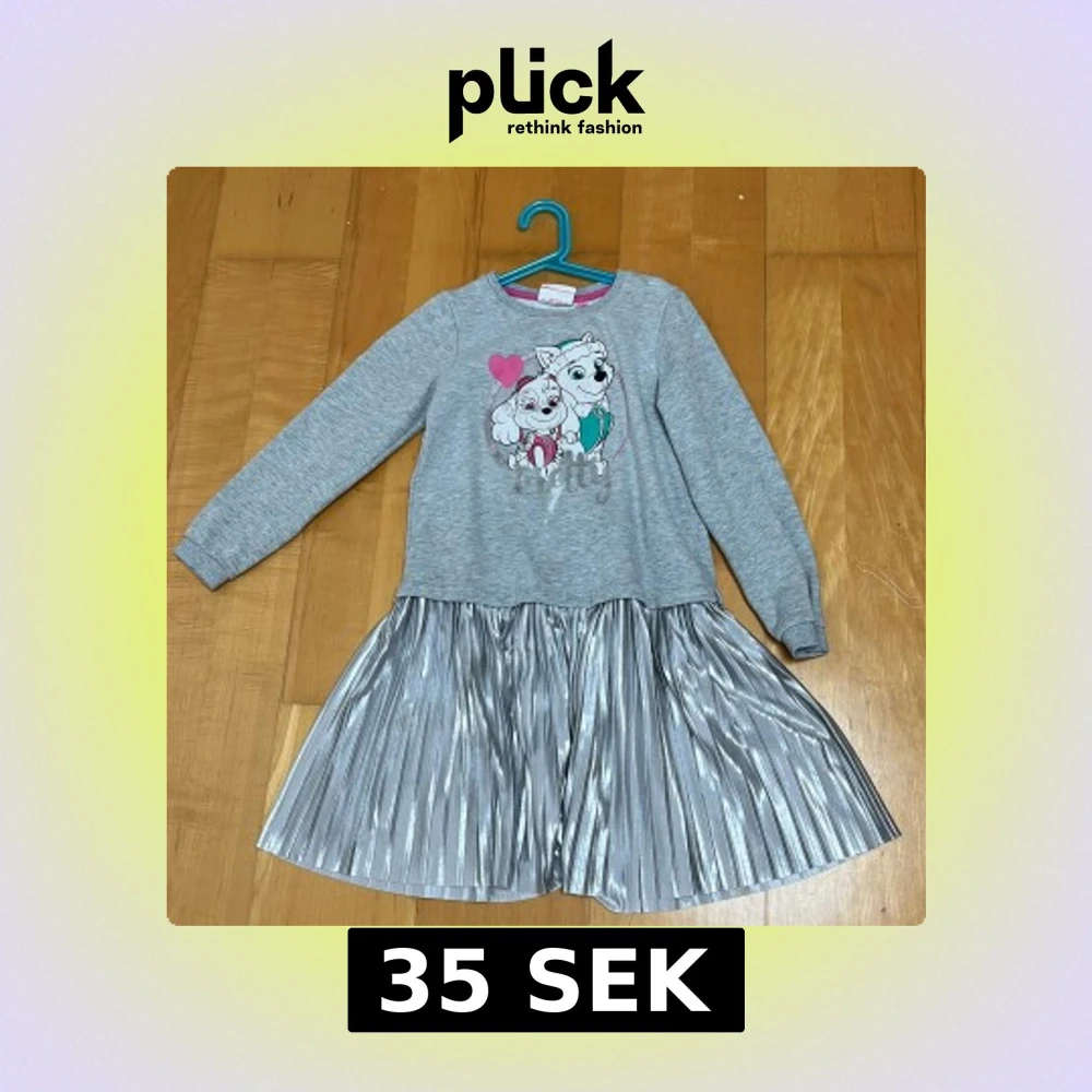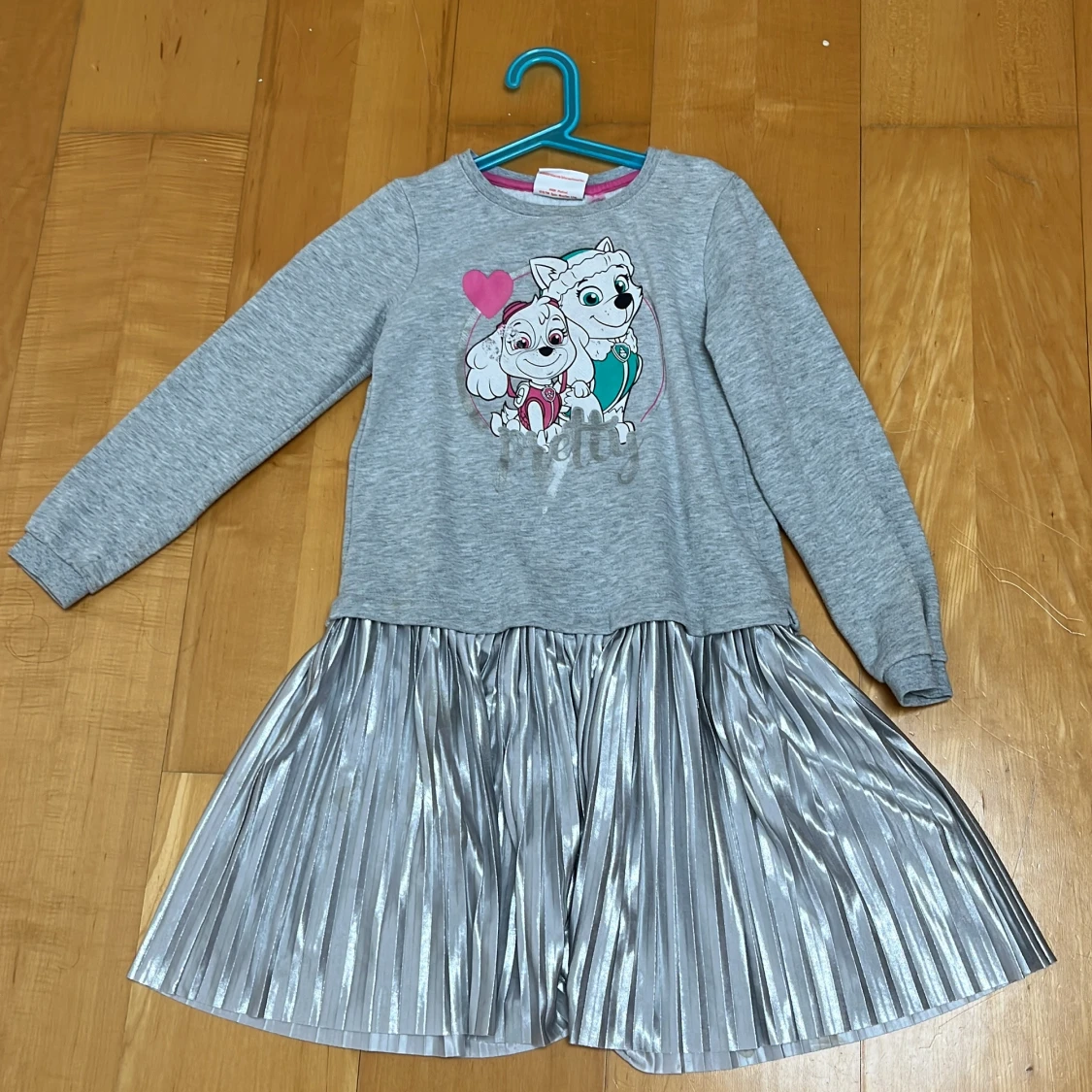 Supersöt grå klänning med långärmad överdel och tryck av Paw Patrol-karaktärer framtill. Kjolen är plisserad och skimrande i silver, vilket ger en cool kontrast. Perfekt för dig som gillar både bekvämt och glittrigt! Rund hals och mjukt material upptill.