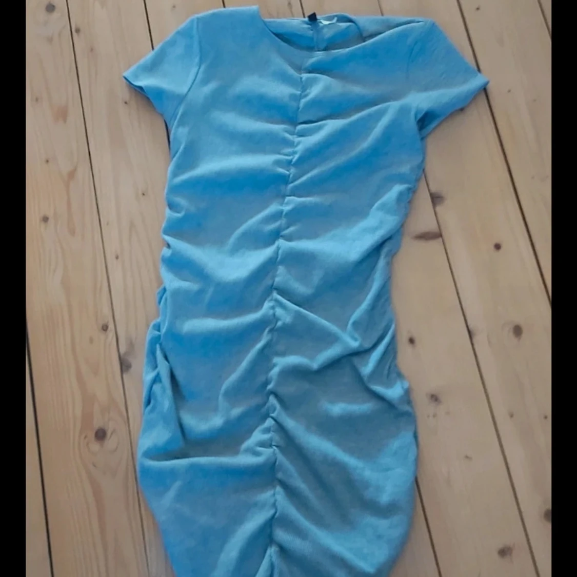 Snygg grå klänning med rynkdetaljer längs framsidan. Den har korta ärmar och en figurnära passform som framhäver silhuetten. Perfekt för en somrig look!