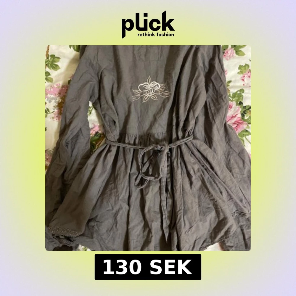 Supersöt grå kortklänning från Tina Wodstrup med långa ärmar, knappar framtill och broderad blomdetalj på ryggen. Klänningen har knytband i midjan, spetsdetaljer vid ärmslut och nederkant samt veckad överdel för extra stil.