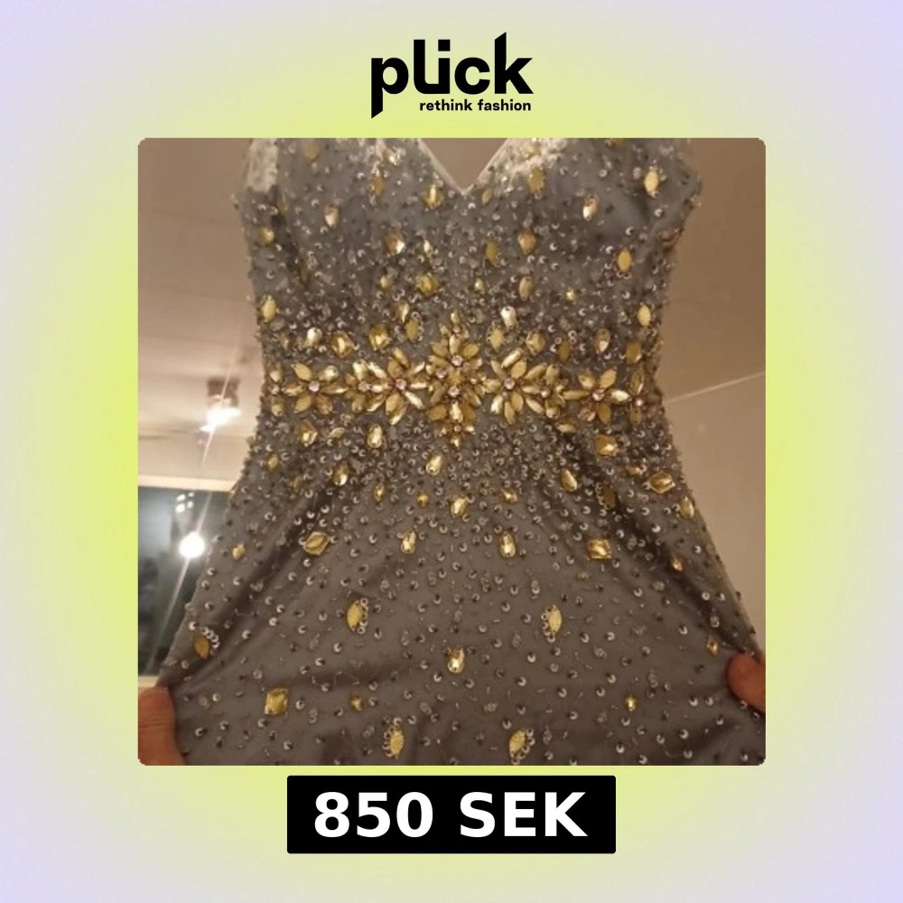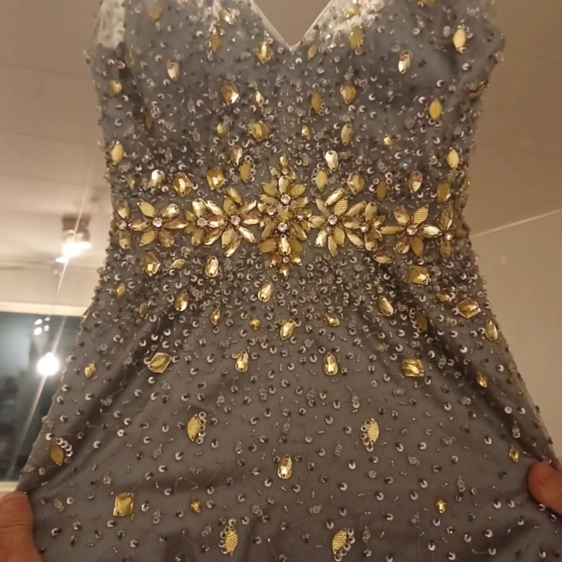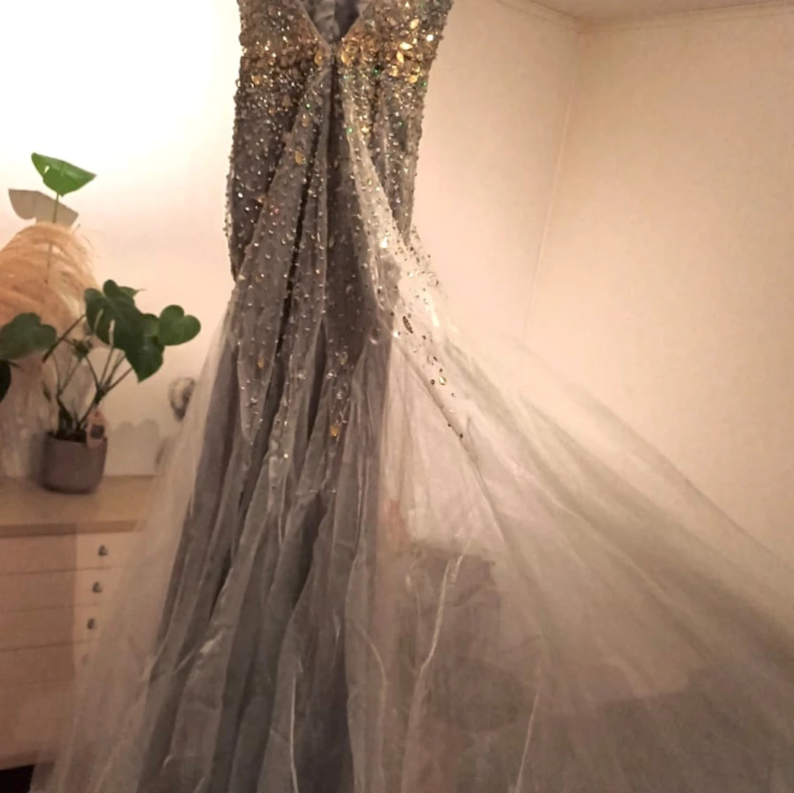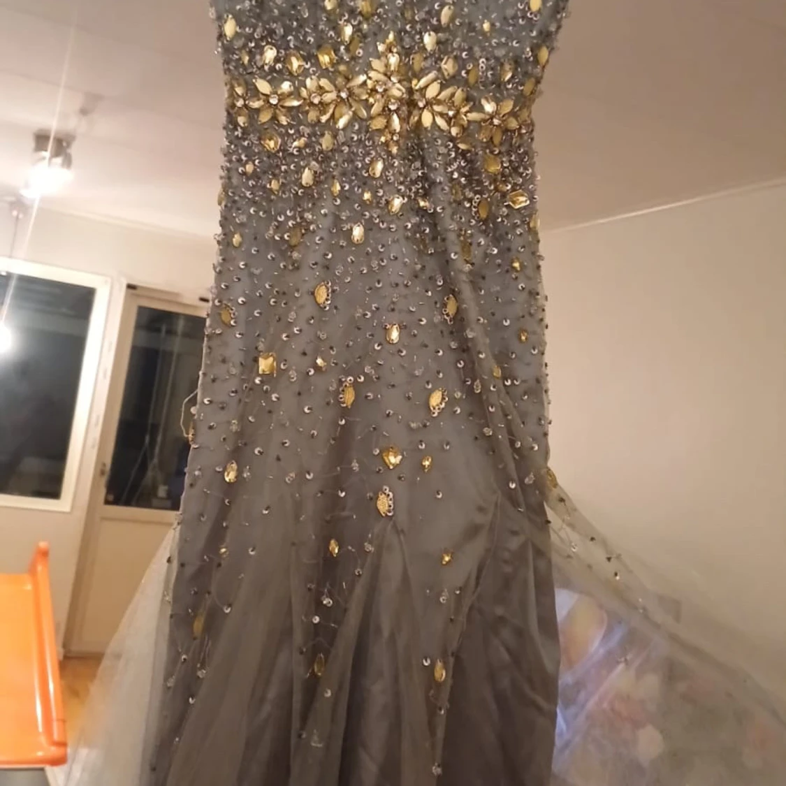 Säljer en riktigt maffig grå långklänning med massor av guldiga paljetter och stenar upptill. Klänningen har v-ringning och markerad midja med blommönster av stenar. Kjolen är i flera lager av tunn tyll som ger en riktigt prinsesskänsla.