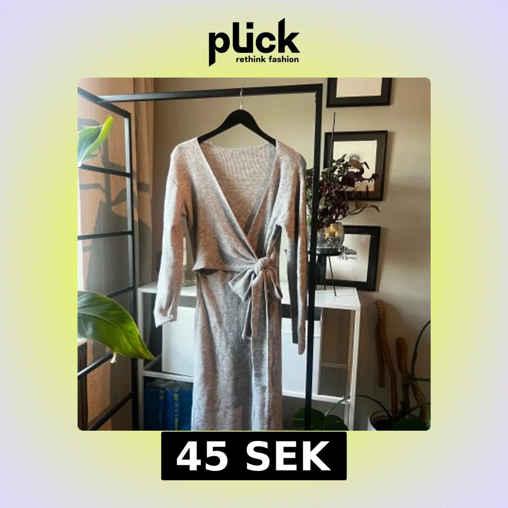 Mysig grå lång stickad klänning med omlott och knyt i midjan. Klänningen har lång ärm och v-ringning framtill, vilket ger en avslappnad men ändå stilren look. Perfekt för dig som gillar bekväma och snygga outfits under kyligare dagar.