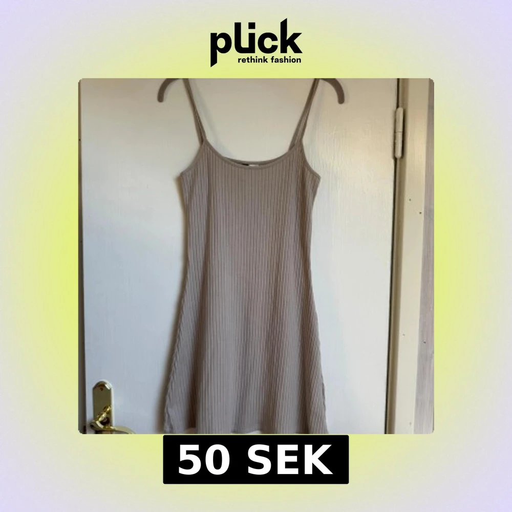 Säljer en grå ribbad klänning med smala axelband och lätt A-linjeformad siluett. Klänningen är kort och har en enkel, stilren look som passar perfekt för varma dagar. Materialet är mjukt och stretchigt för skön passform.