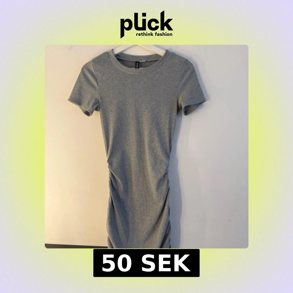 Säljer en grå ribbad kortklänning från Divided i storlek S. Klänningen har korta ärmar, rund halsringning och snygg rynkdetalj på sidan som ger en cool twist. Perfekt för dig som gillar enkel men trendig stil.