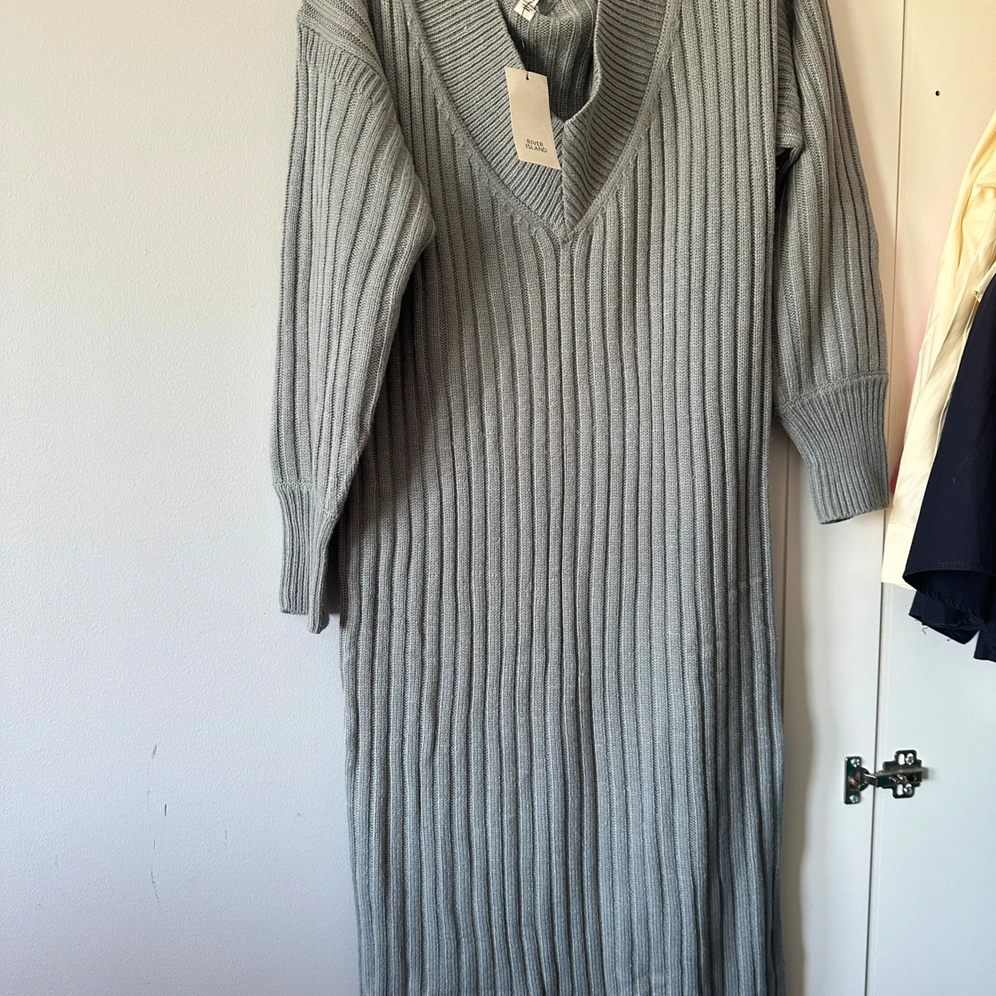 Snygg grå ribbstickad långklänning från River Island med v-ringning och trekvartsärm. Klänningen har en loose passform och är perfekt för dig som gillar en enkel men trendig stil. Materialet är mjukt och stickat, vilket gör den superbekväm.