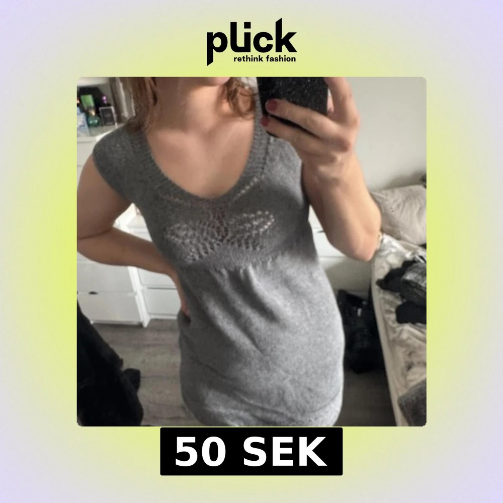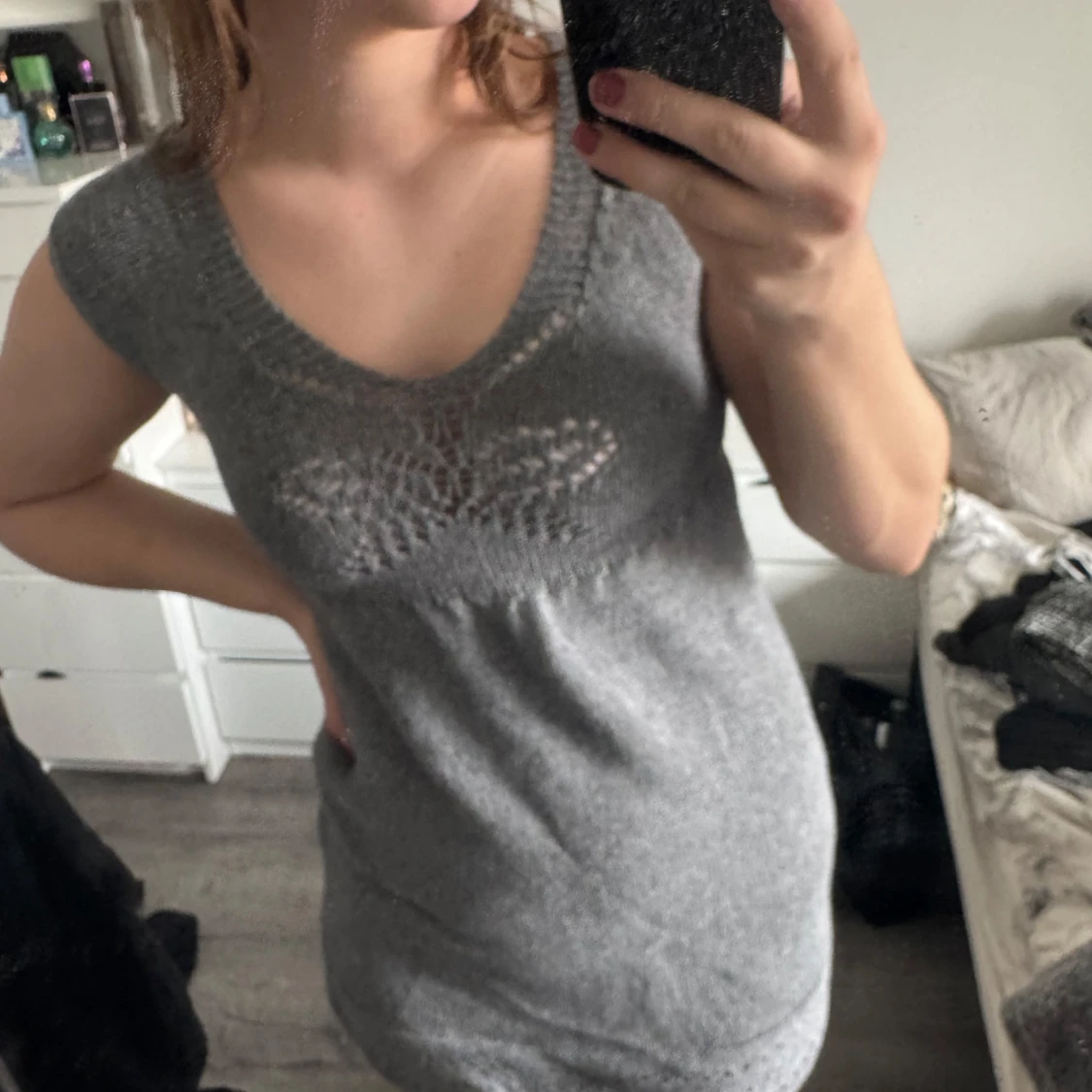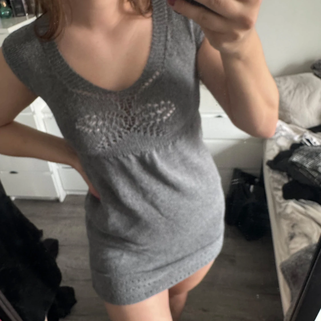 mysig grå stickad med korta ärmar och ett fint hålmönster vid bysten i form av en fjäril. (Katt och kanin finns i hemmet)