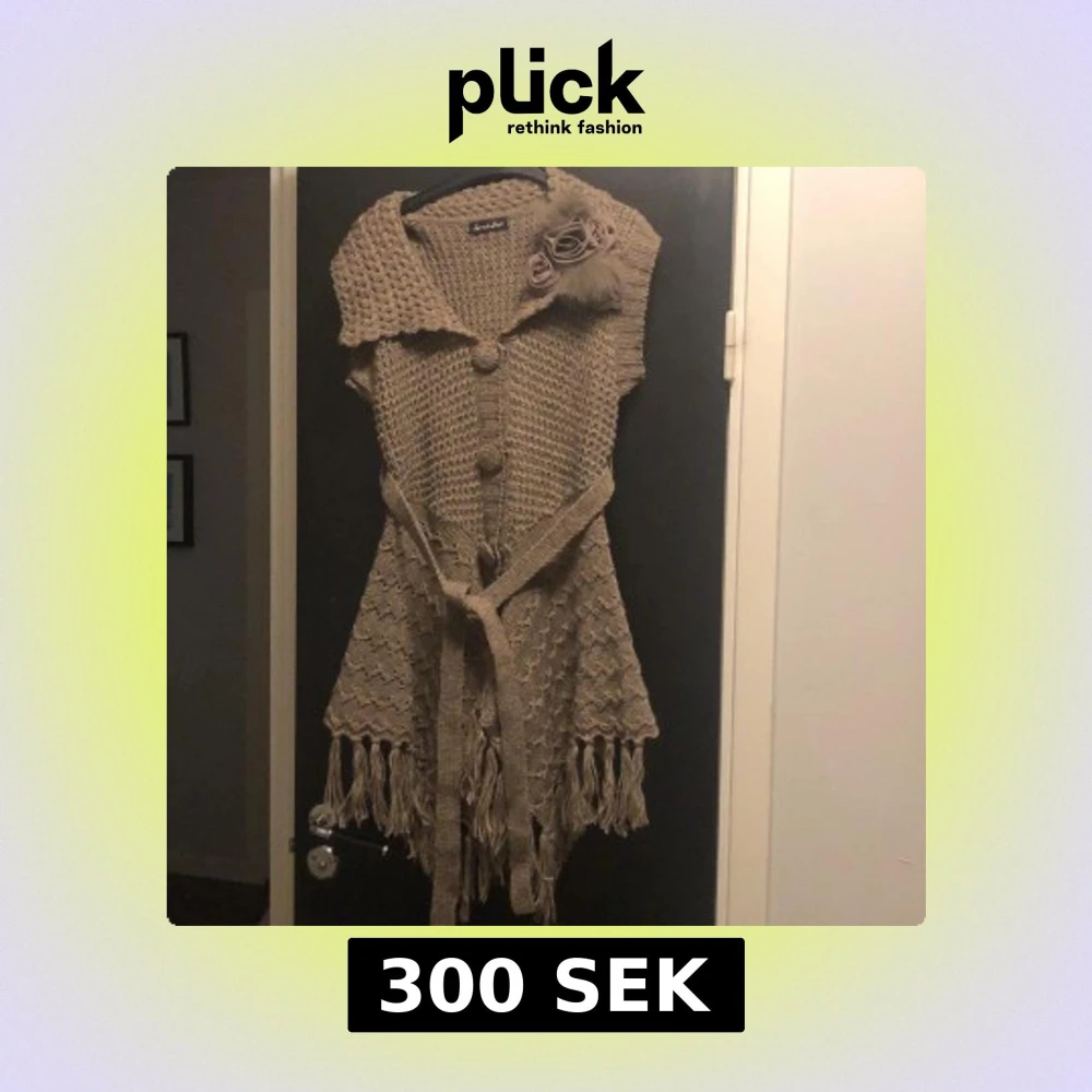 Snygg grå stickad kofta/klänning från Seven Star med knappar och fransar. Den har en unik design med en stor krage och dekorativa blommor på axeln. Perfekt för att lägga till en bohemisk touch till din outfit. 35% ull. Passar både medium och large.