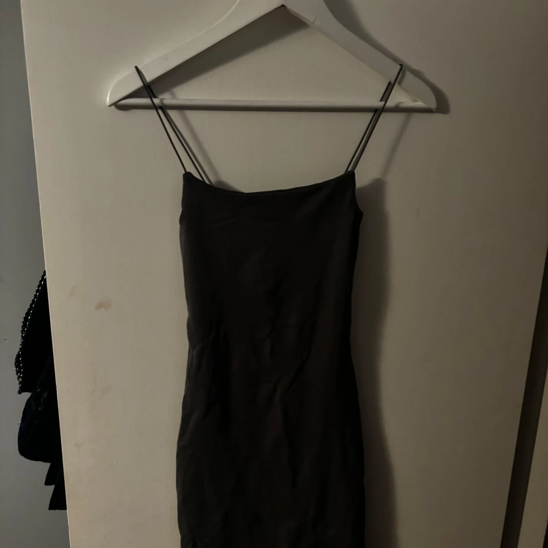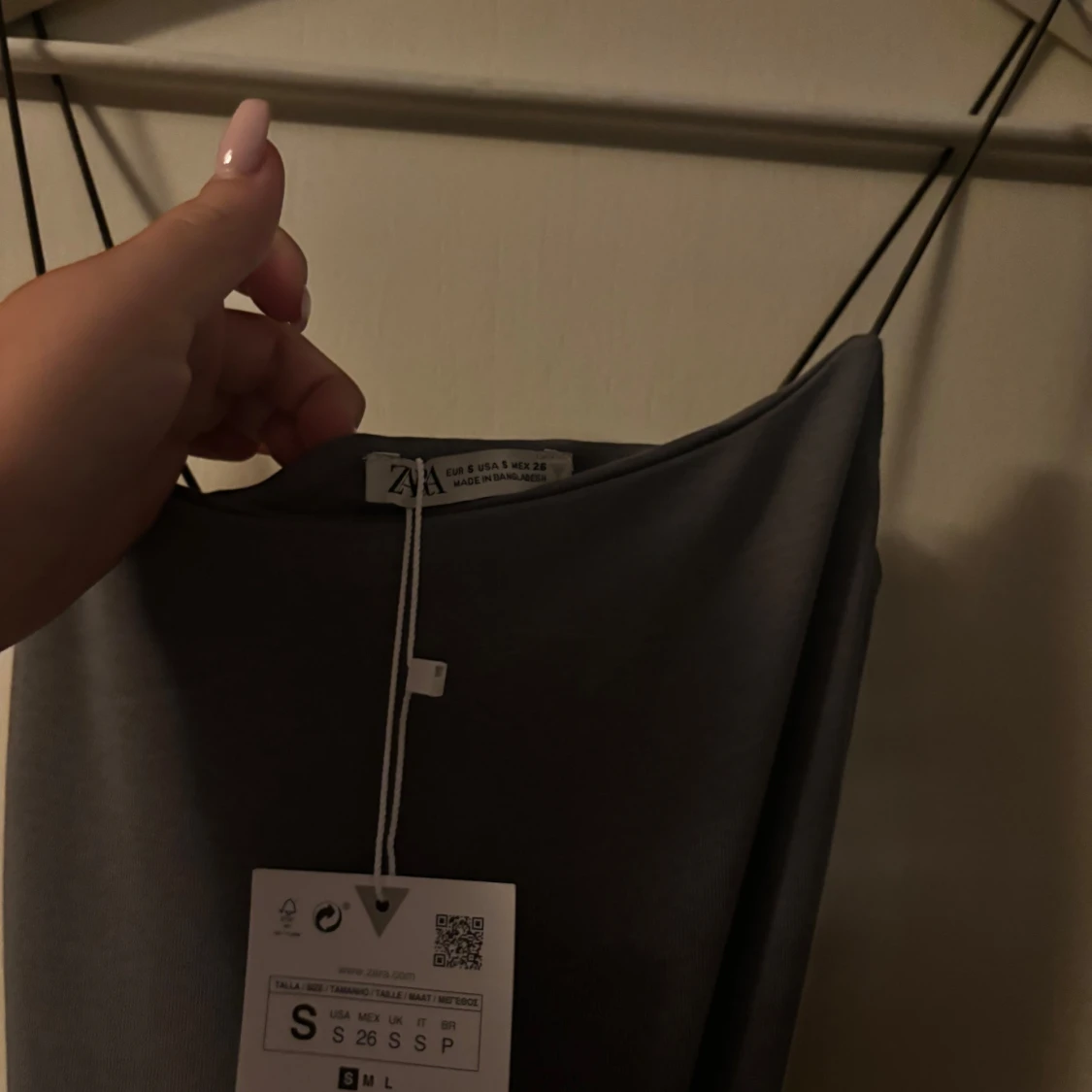Säljer en stilren grå klänning från Zara. Den är ärmlös med smala axelband och har en tight passform. Perfekt för en festkväll eller en utekväll med vänner. Klänningen är i nyskick. Den är grå som på den bilden med lappen men har bara bild på svarta