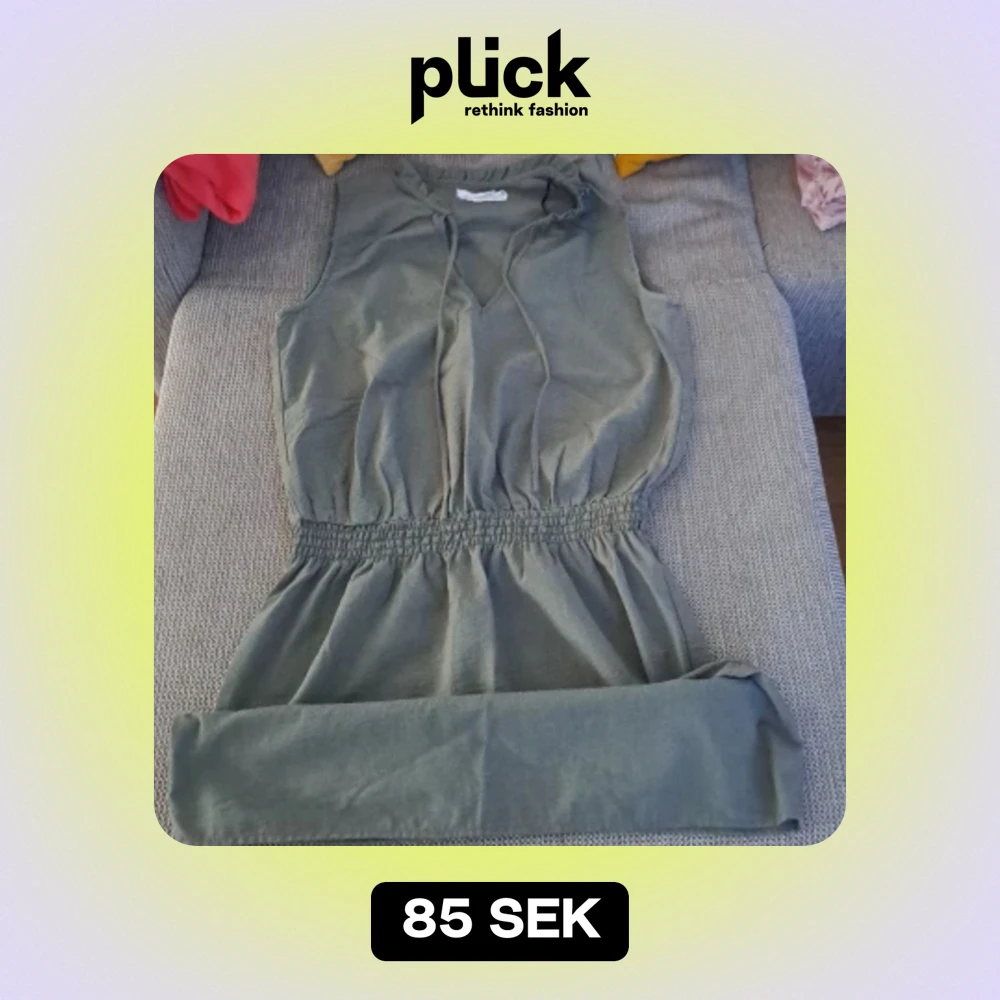 En grön ärmlös klänning med resår i midjan och knytband vid halsen. Klänningen har en enkel och bekväm design, perfekt för vardagsbruk. inte använt. 100% ny.