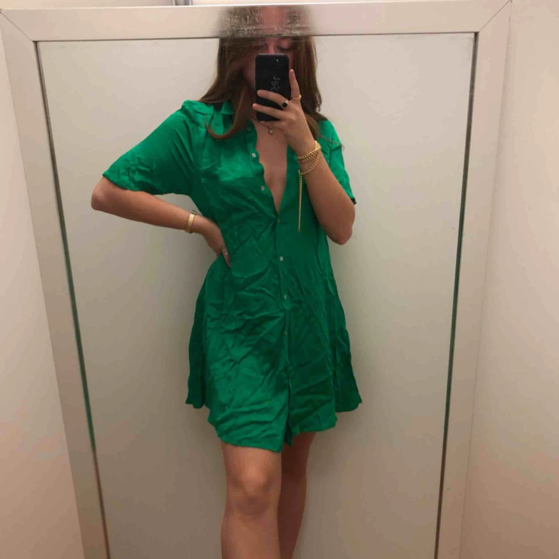 Superfin grön klänning i satinaktigt tyg. Använd 2ggr. Säljer för använder den så sällan. Vill man ha tajtare i midjan så är den superfin med ett skärp som jag håller med handen på första bilden. Frakt ingår i priset✨