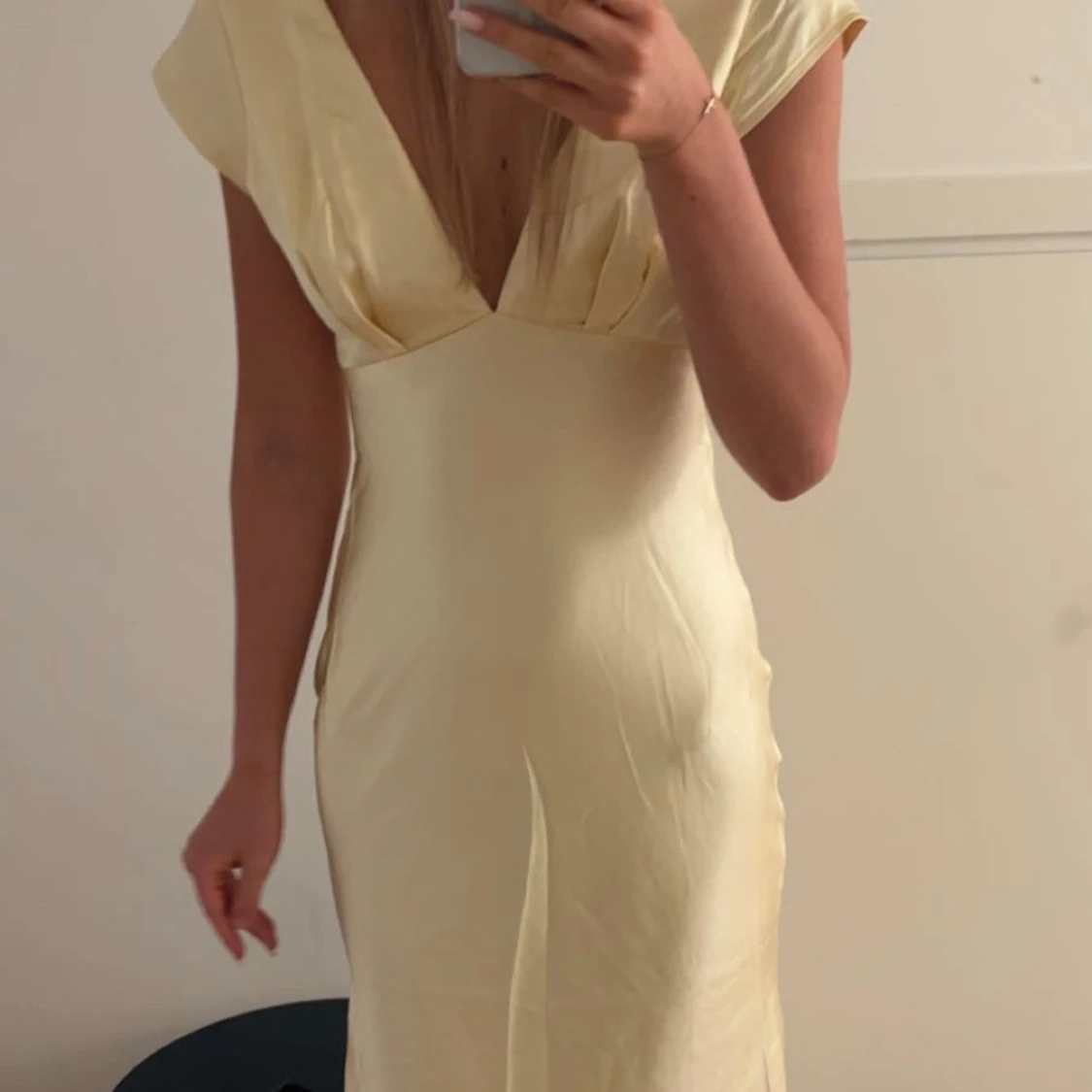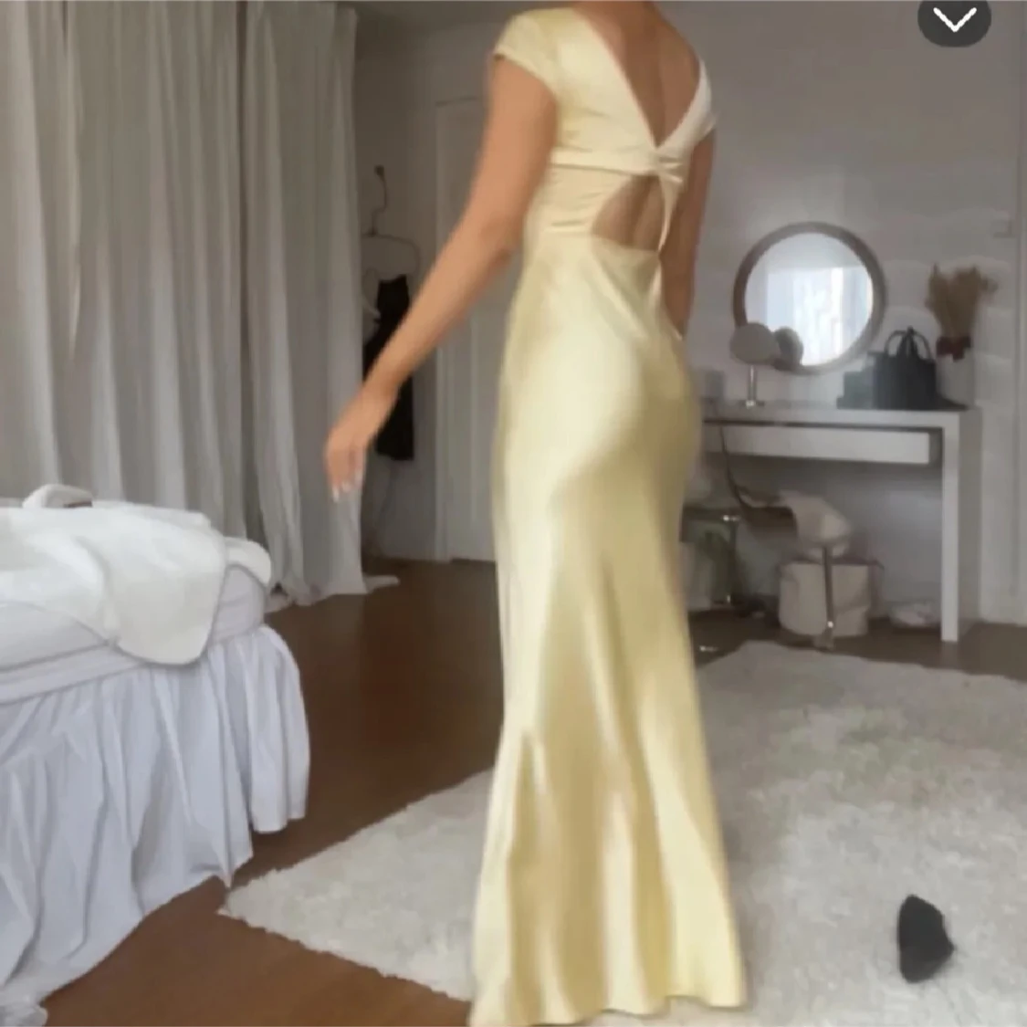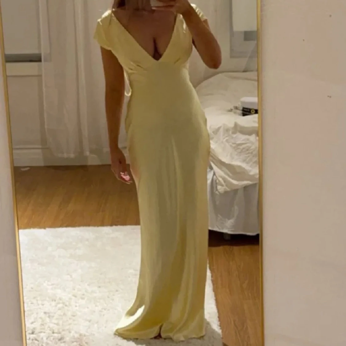 Säljer en elegant ljusgul långklänning i satin med djup v-ringning och korta ärmar. Klänningen har en snygg öppen rygg med twist-detalj och figurnära passform som ger en lyxig känsla. Perfekt till bal eller student 🩷 använd 1 gång, inga defekter
