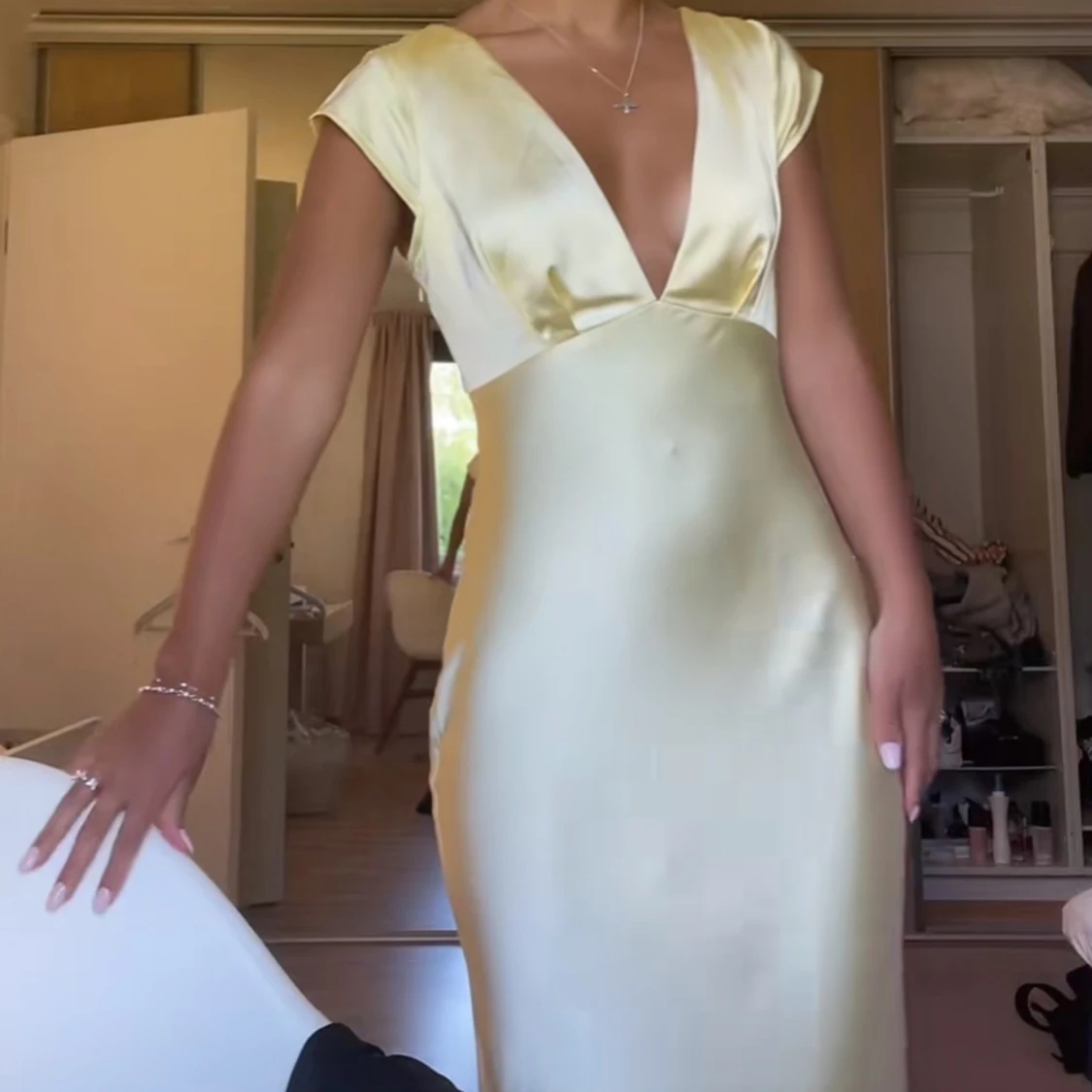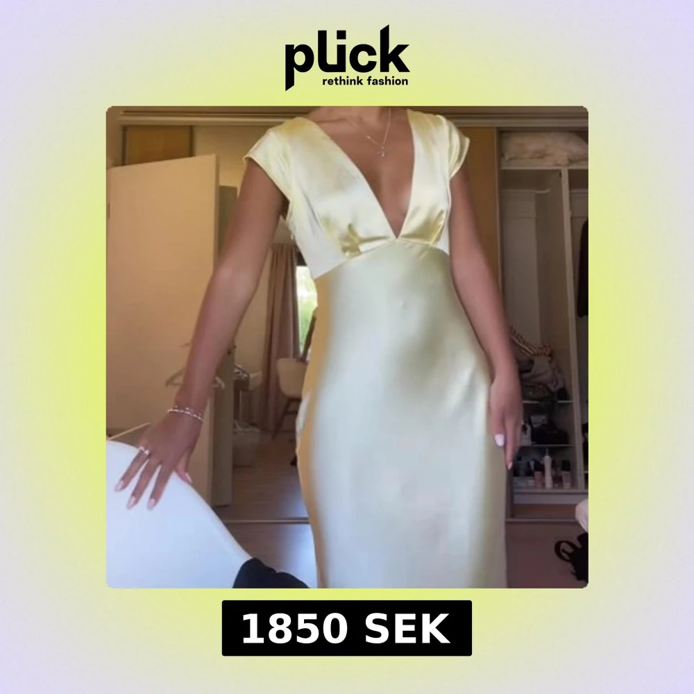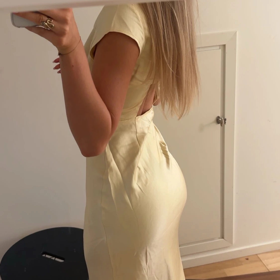 Säljer en elegant ljusgul långklänning i satin med djup v-ringning och korta ärmar. Klänningen har en snygg öppen rygg med twist-detalj och figurnära passform som ger en lyxig känsla. Perfekt till bal eller student 🩷 använd 1 gång, inga defekter