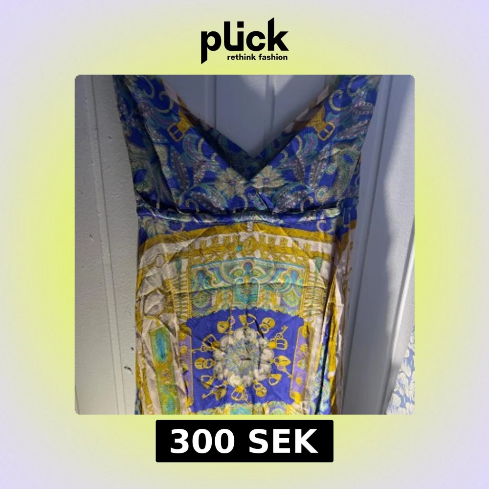 Säljer en färgglad klänning från Tiglund Malmö med ett unikt mönster i blått, gult och grönt. Klänningen har en omlott-design och är ärmlös, perfekt för sommarens festligheter.