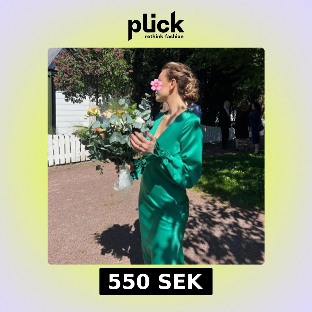 Säljer en grön långklänning i glansigt satinmaterial med en jättefin v-ringning och knytdetalj där bak. Klänningen har långa ärmar med knyt vid handlederna och öppen rygg med snörningsdetalj. Perfekt för bal eller finare tillfällen. 🫶🏽 inga defekter och är som ny.