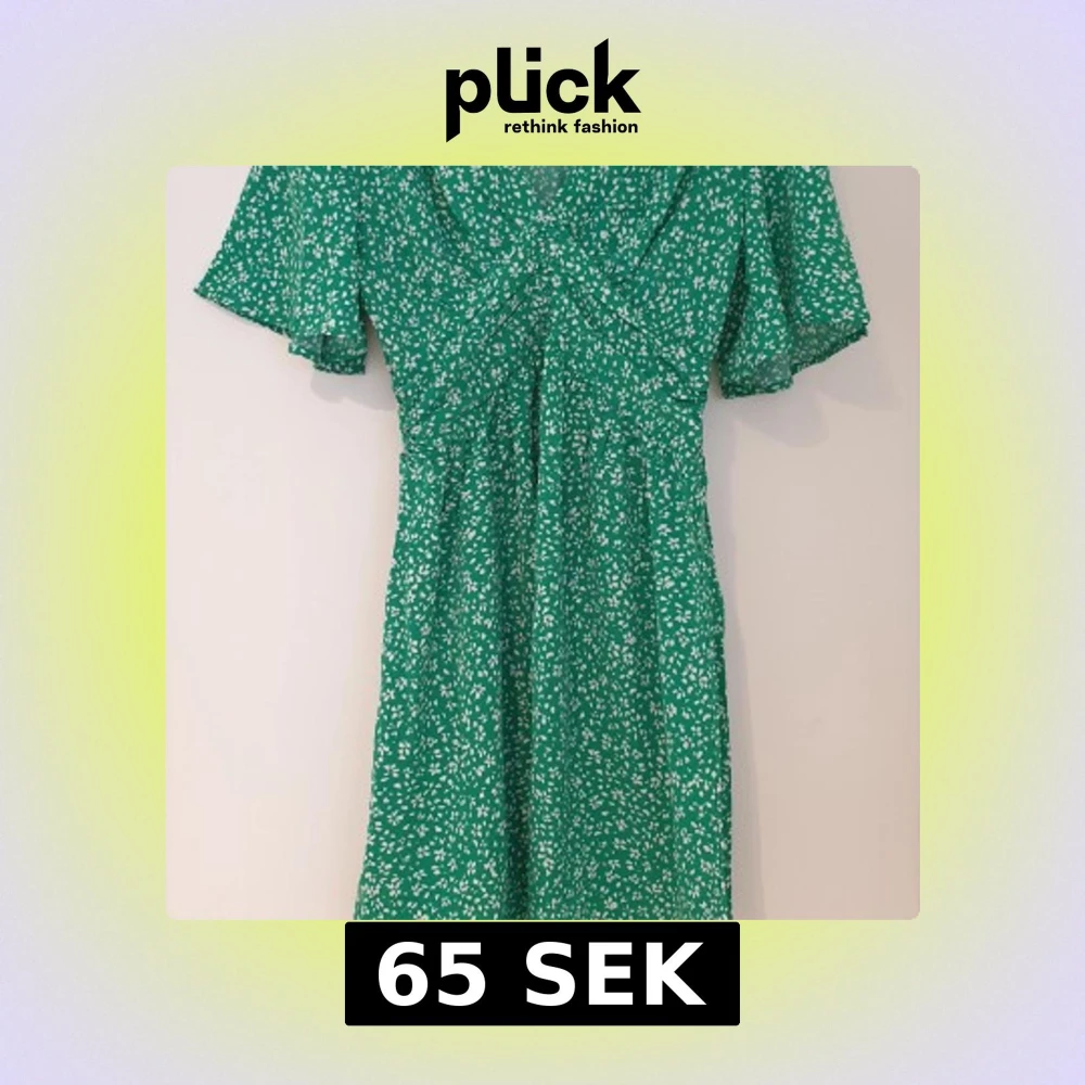 Säljer en grön kortklänning från SHEIN med vitt blommigt mönster. Klänningen har korta ärmar, v-ringad hals och markerad midja. Perfekt för vår och sommar!