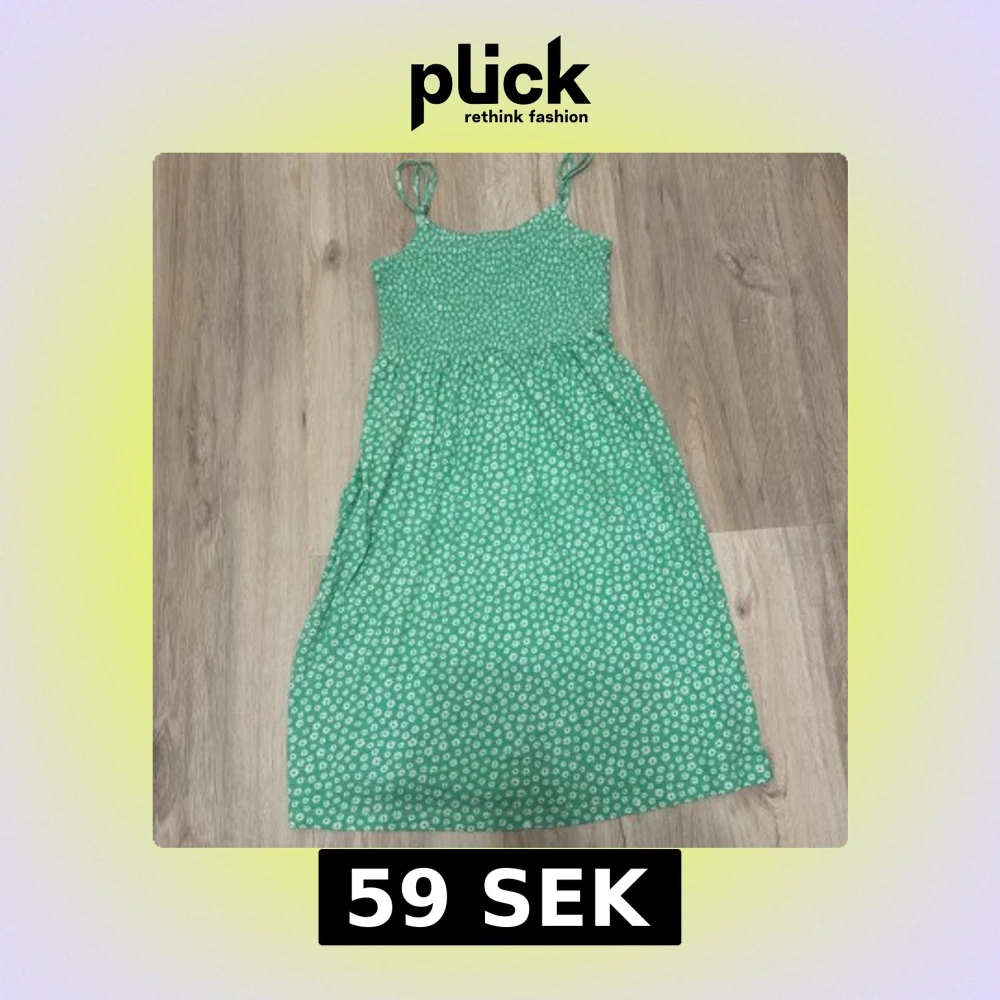 Söt grön klänning med vita blommor och smala axelband. Perfekt för varma dagar med sin lätta och luftiga design. Klänningen har en avslappnad passform och når till knäna.