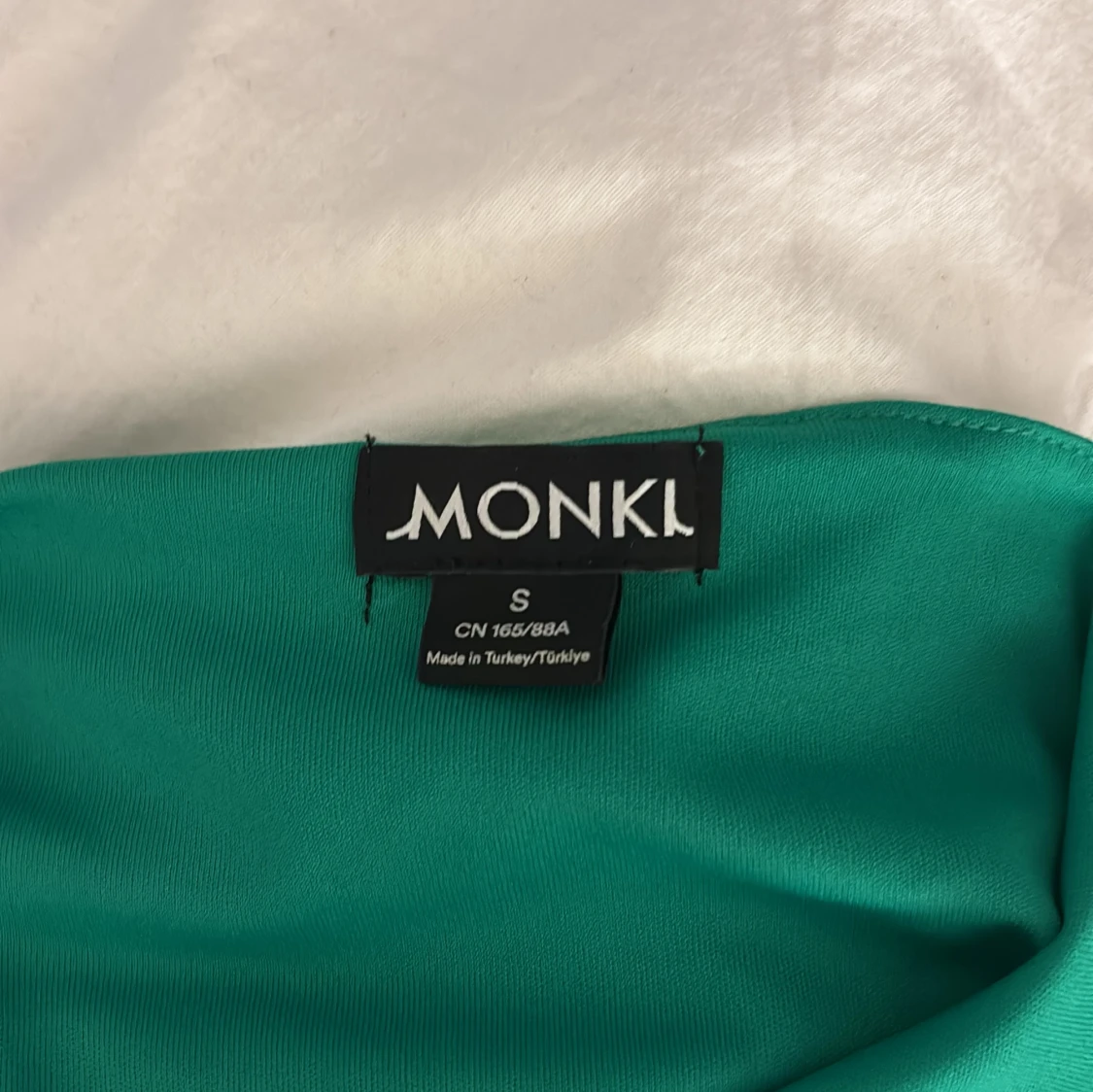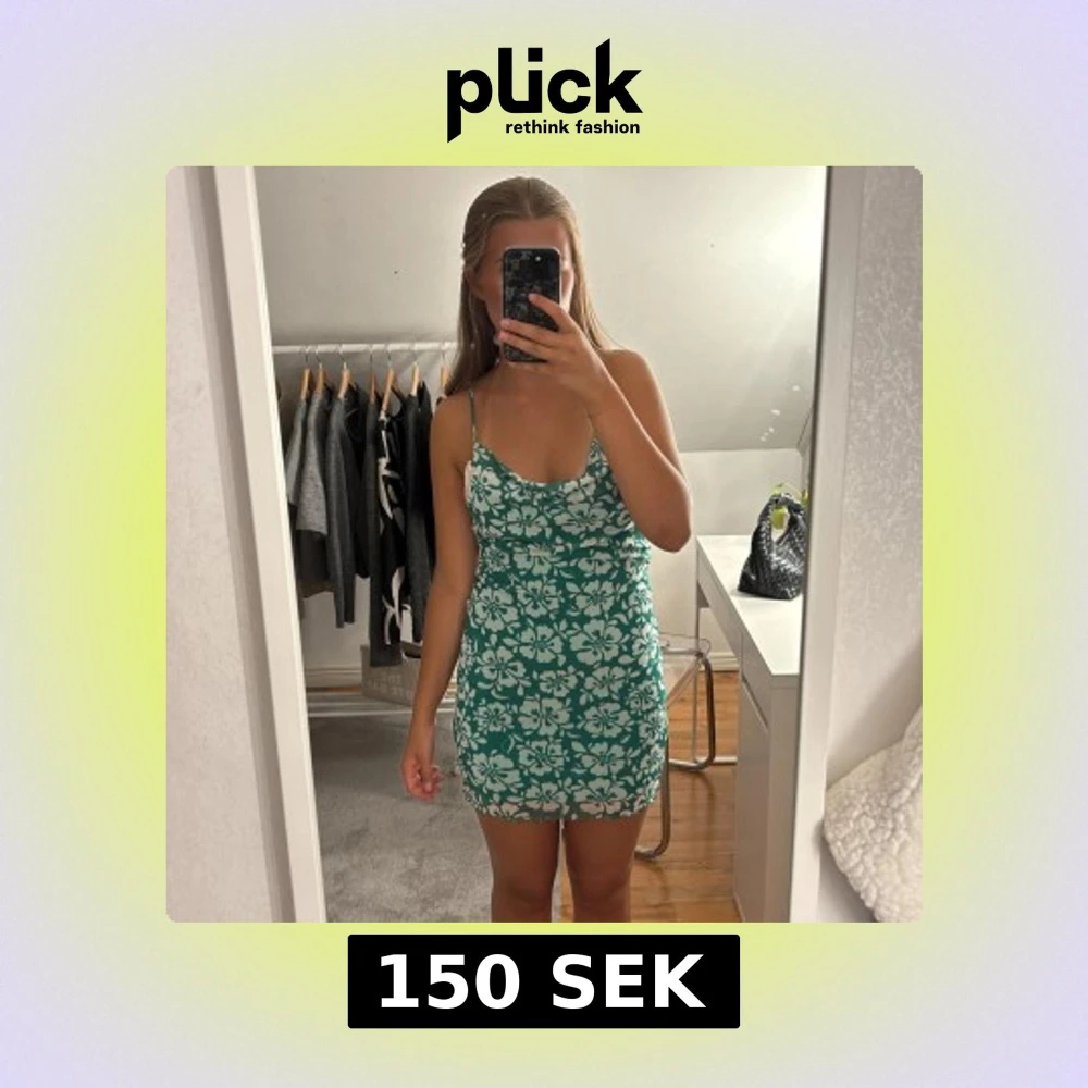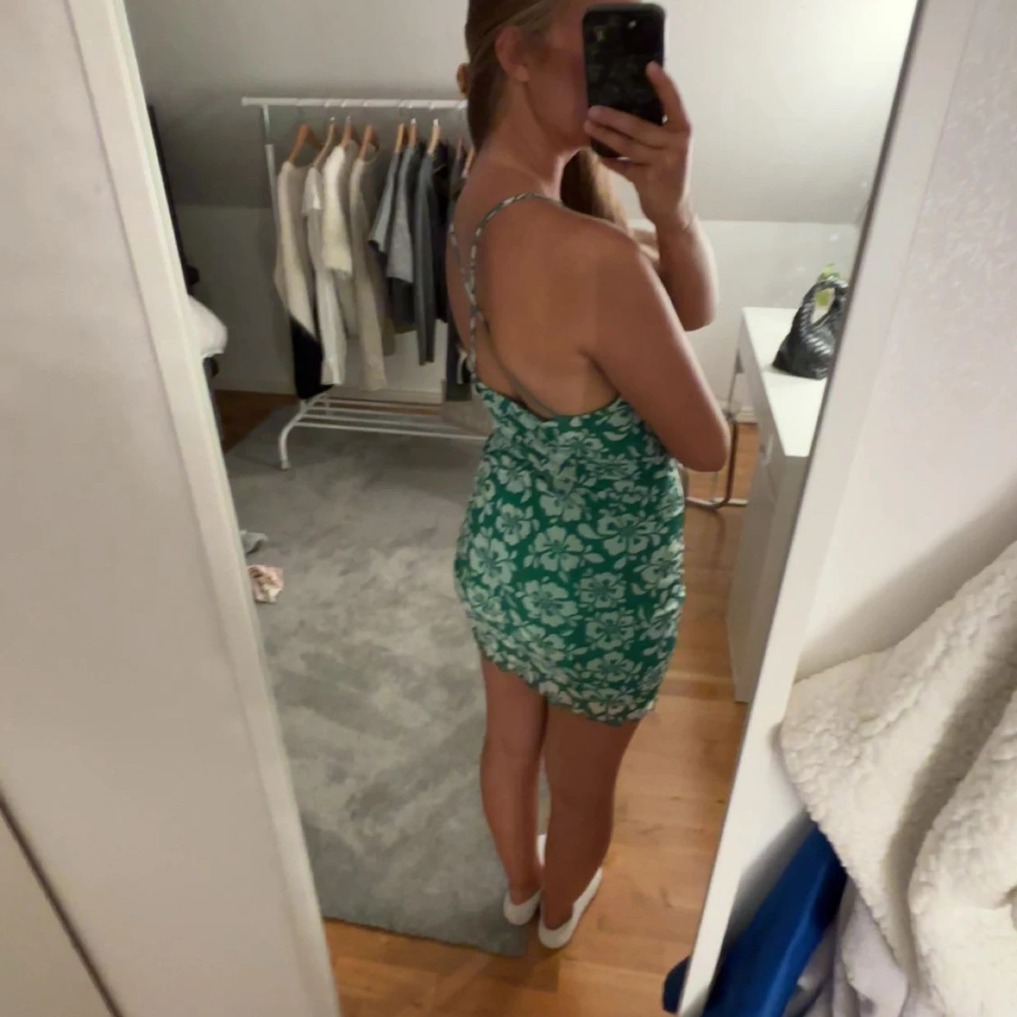 Superfin grön kortklänning från Monki med vita blommor, smala axelband och lätt draperad urringning. Sitter tajt och har en somrig vibe, perfekt för dig som vill sticka ut. Materialet känns svalt och mjukt mot huden.