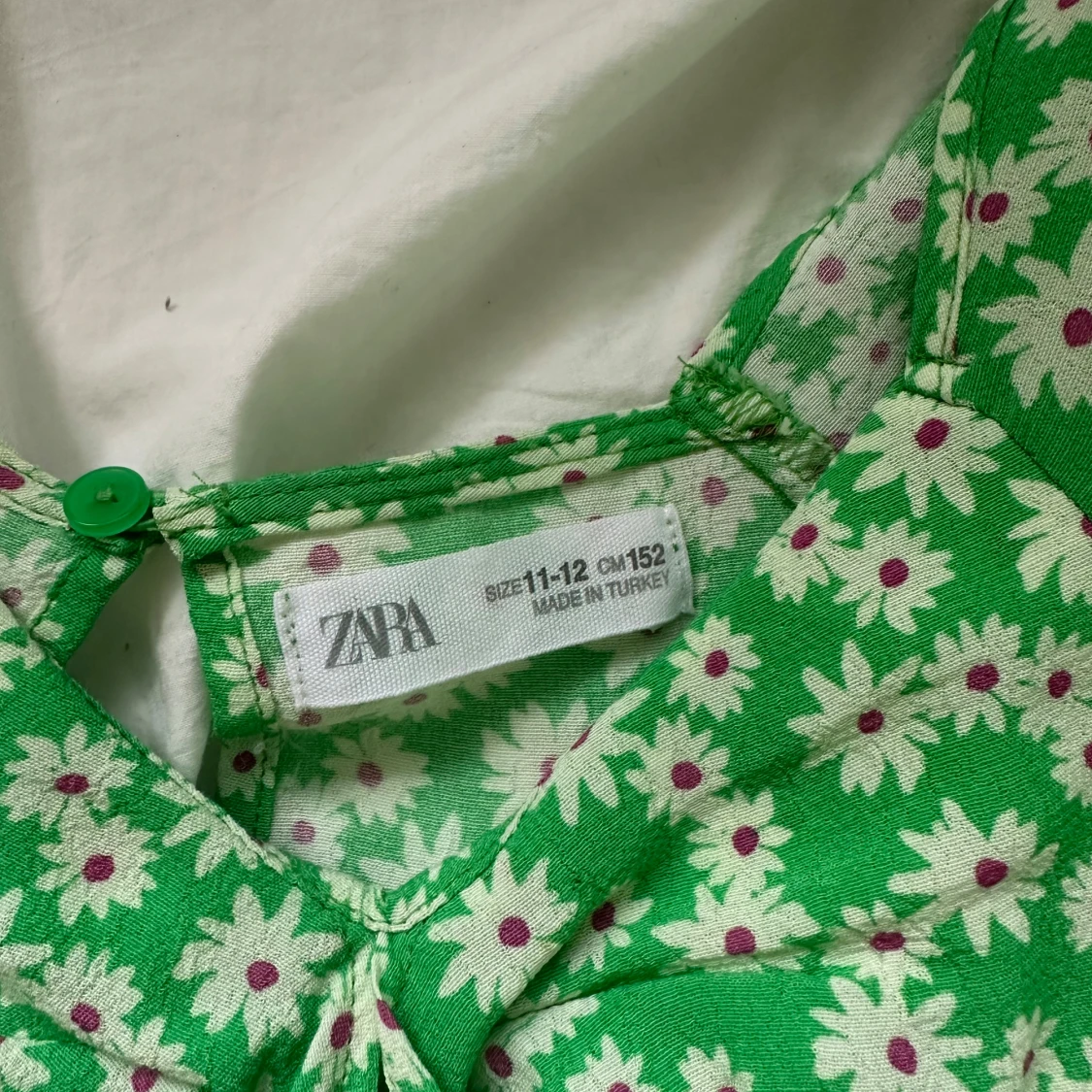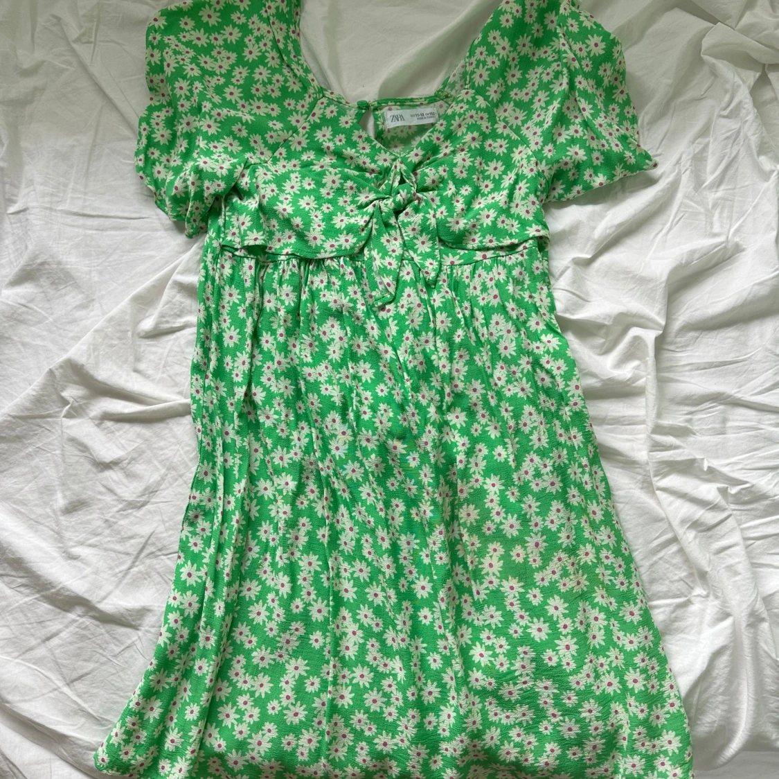 Supersöt grön kortklänning från Zara med vita och rosa blommor. Klänningen har korta ärmar, v-ringning och knytning framtill. Perfekt för varma dagar och ger en fräsch sommarkänsla. Lätt och luftig modell som är riktigt bekväm.