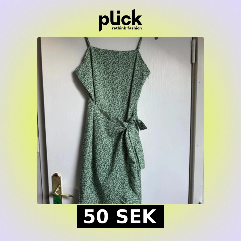 Söt grön klänning med små vita blommor, smala axelband och omlottknytning i midjan. Lätt och flowy modell som ger en avslappnad vibe, perfekt för varma dagar. Klänningen har en feminin siluett och är knälång.