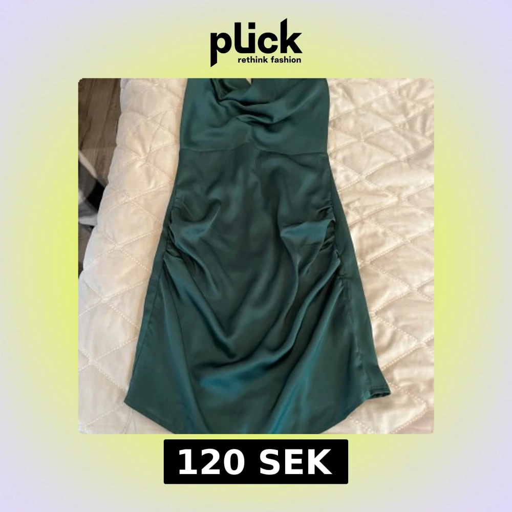 Säljer en smaragdgrön bodyconklänning från Boohoo med draperad halsringning och smala axelband. Klänningen har en tight passform och är tillverkad i ett glansigt, mjukt material som ger en lyxig känsla.