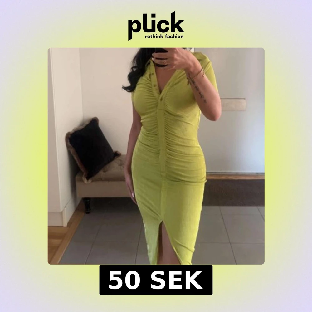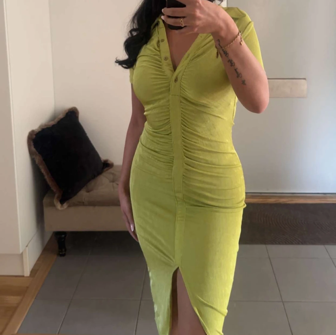 Snygg grön klänning med korta ärmar, v-ringning och knappar upptill. Klänningen är figurnära med rynkade detaljer längs magen och har en slits framtill.