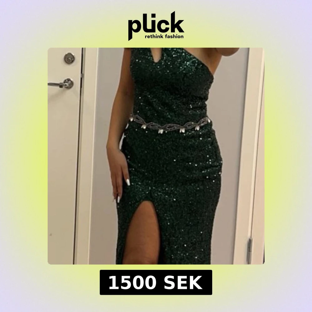 Snygg grön glittrig klänning med en elegant slits framtill och en öppen rygg. Klänningen har en v-ringad design och ett dekorativt bälte i midjan. Perfekt för en festlig kväll!