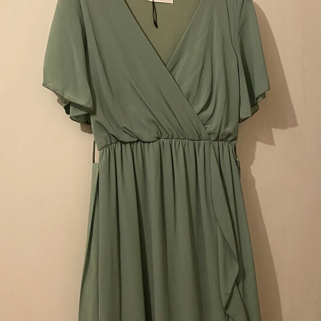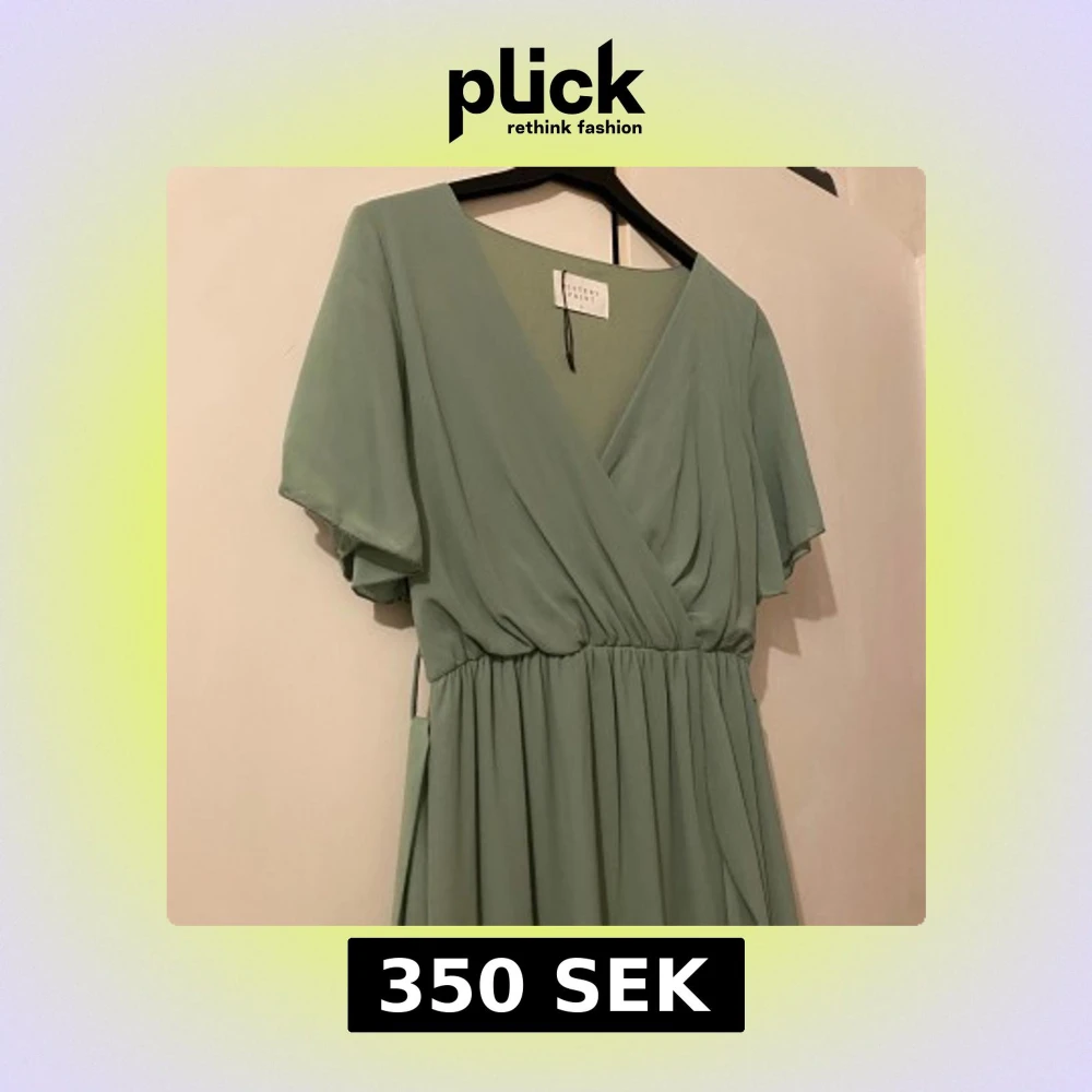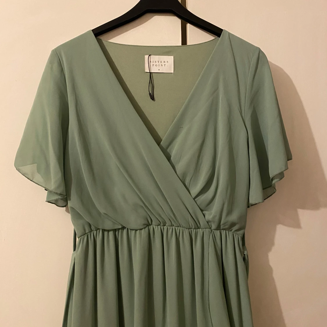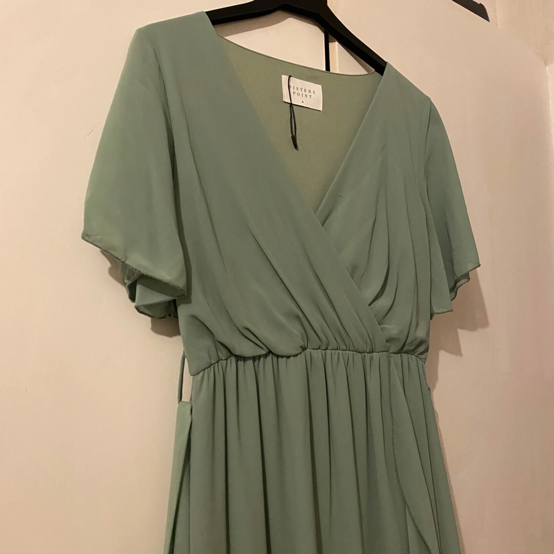 Säljer en elegant grön omlottklänning från Sisters Point. Klänningen har korta ärmar och en v-ringad design med volangdetaljer. Jag har endast haft på mig den 2 gånger.