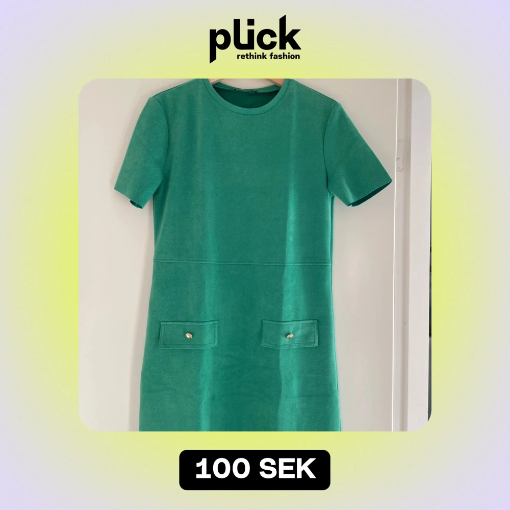 Säljer en snygg grön klänning från Zara i storlek S. Den har korta ärmar och två dekorativa fickor framtill med guldknappar. Perfekt för vår och sommar! 💚