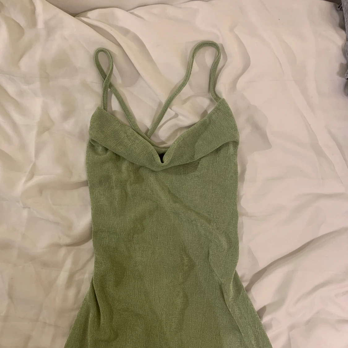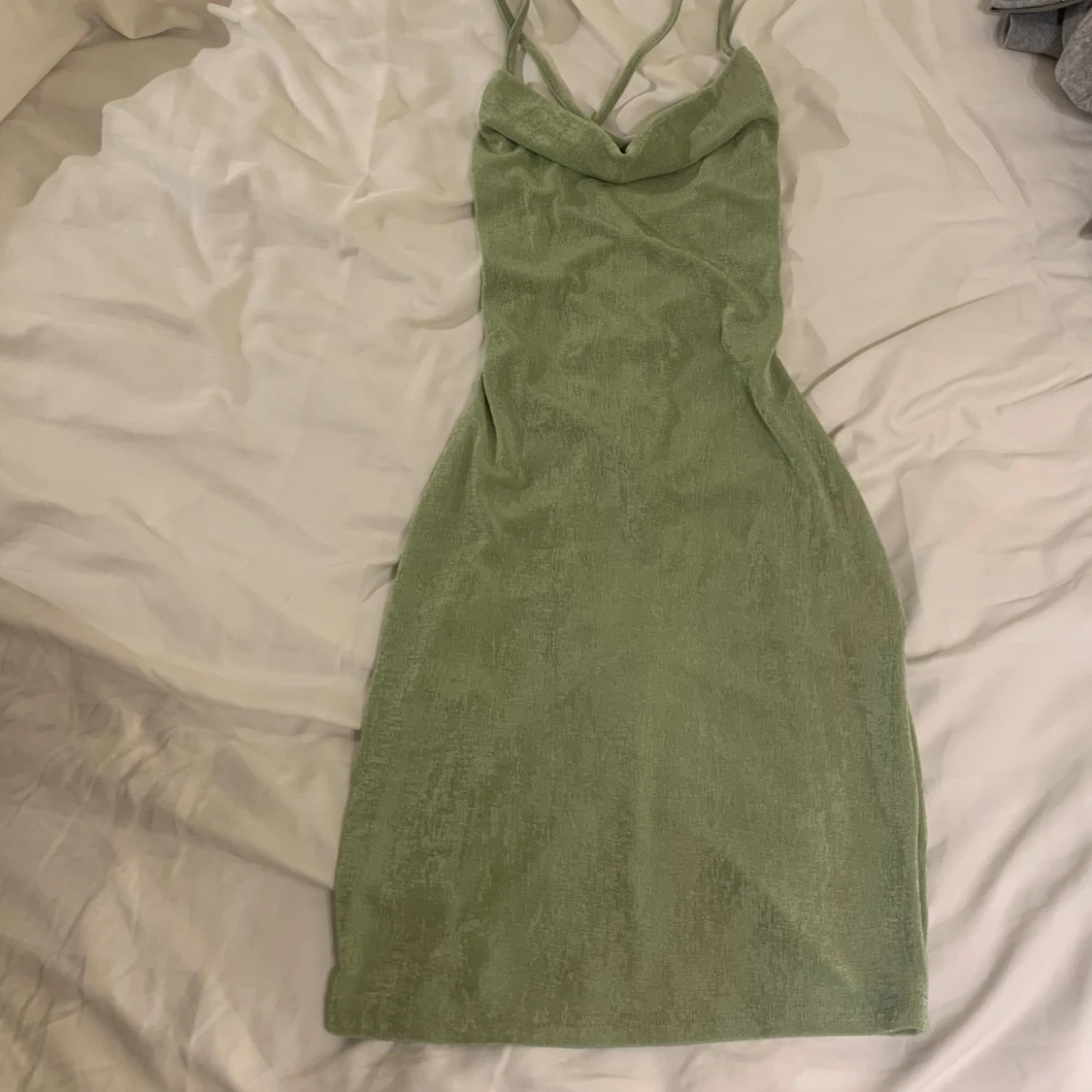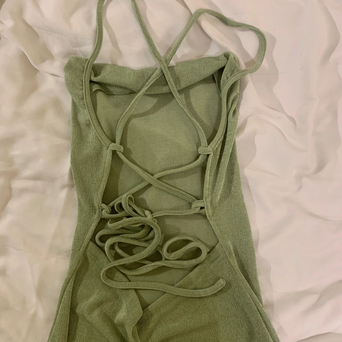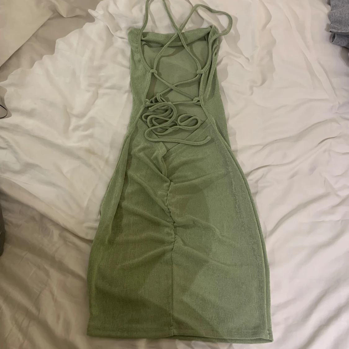 Snygg grön klänning med smala axelband och en stilren design. Klänningen har en öppen rygg med dekorativ snörning som ger en unik touch. Perfekt för sommaren.