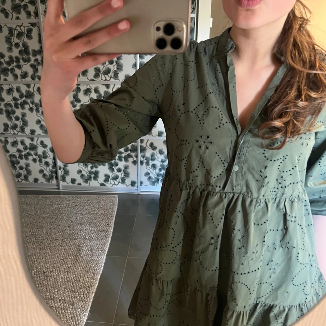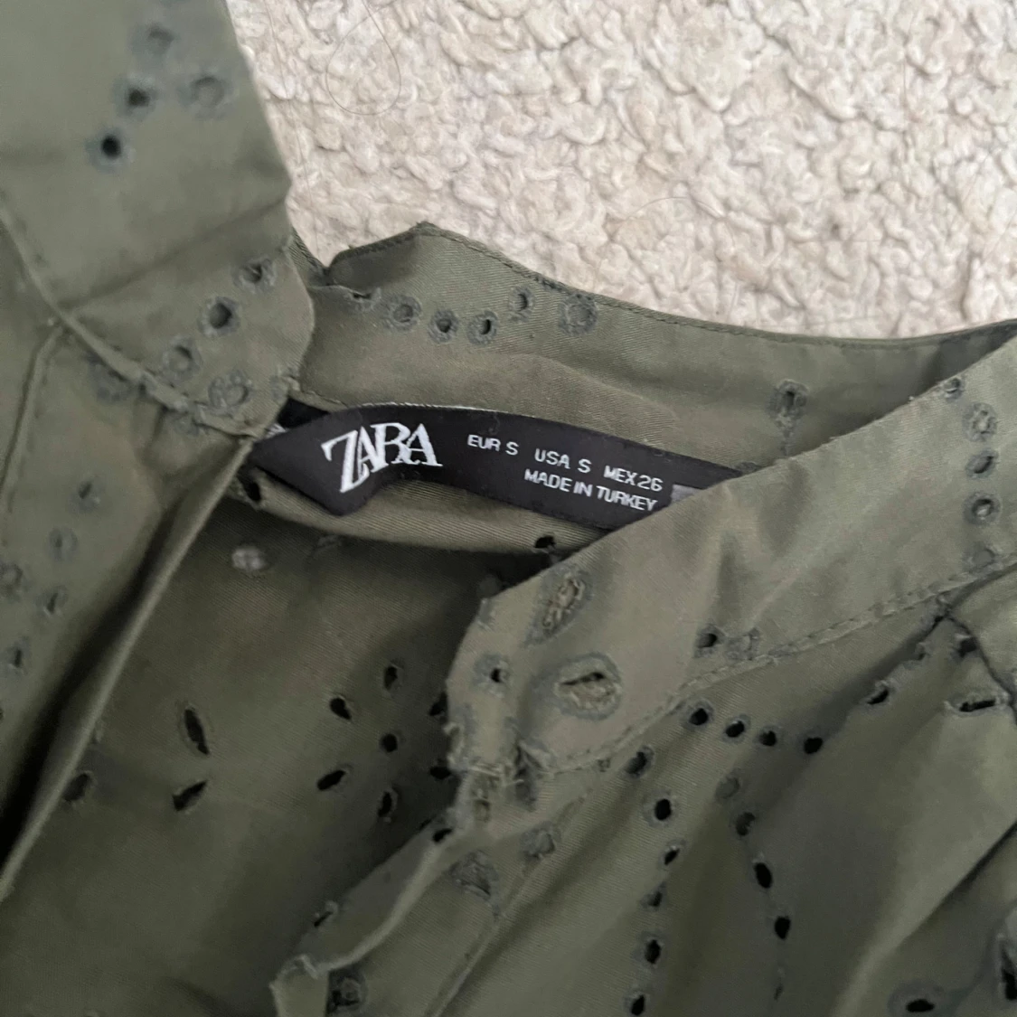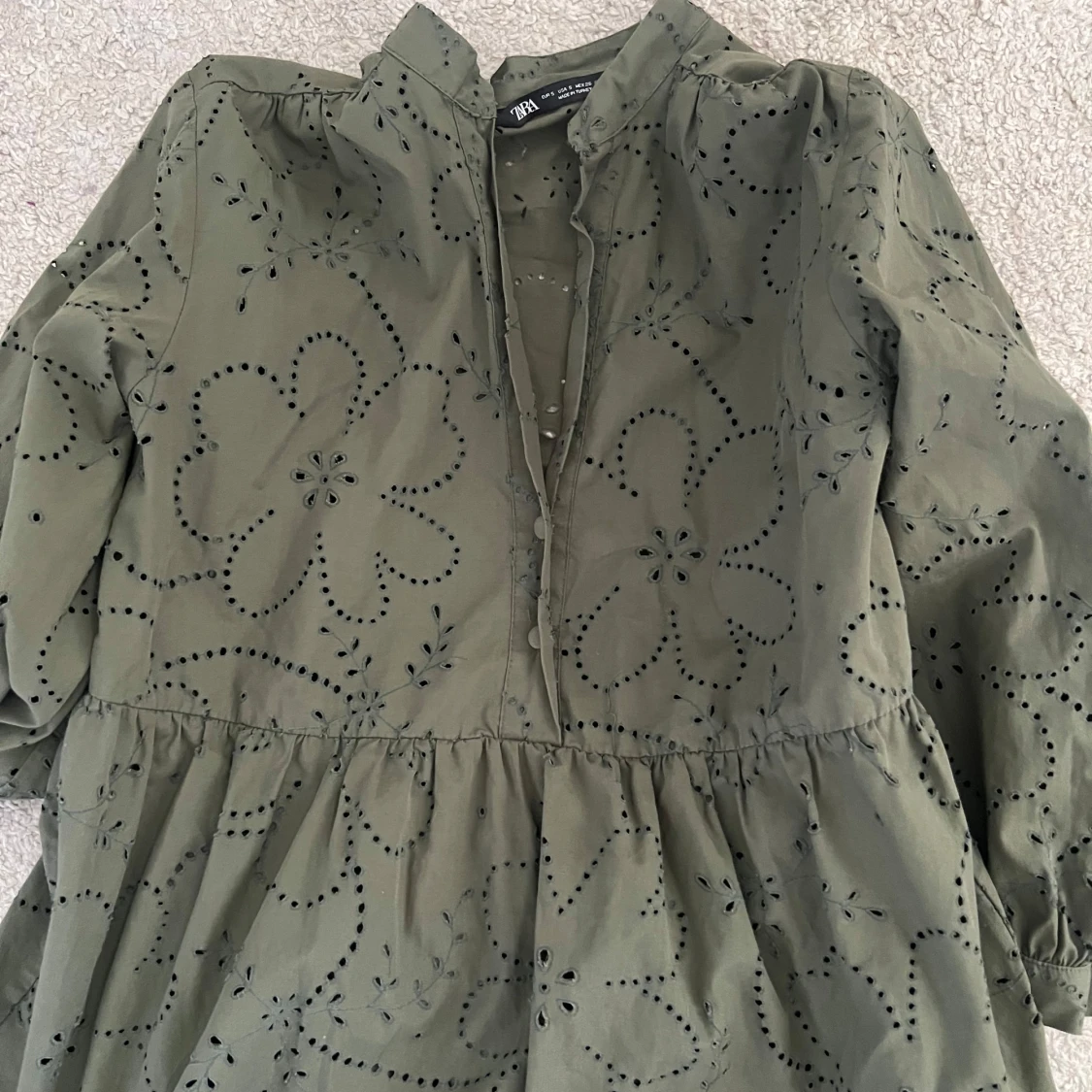 Säljer denna gröna klänningen från Zara med broderat blommönster och v-ringning. Den är i storlek s men passar även xs-m💕och i mycket bra skick☺️