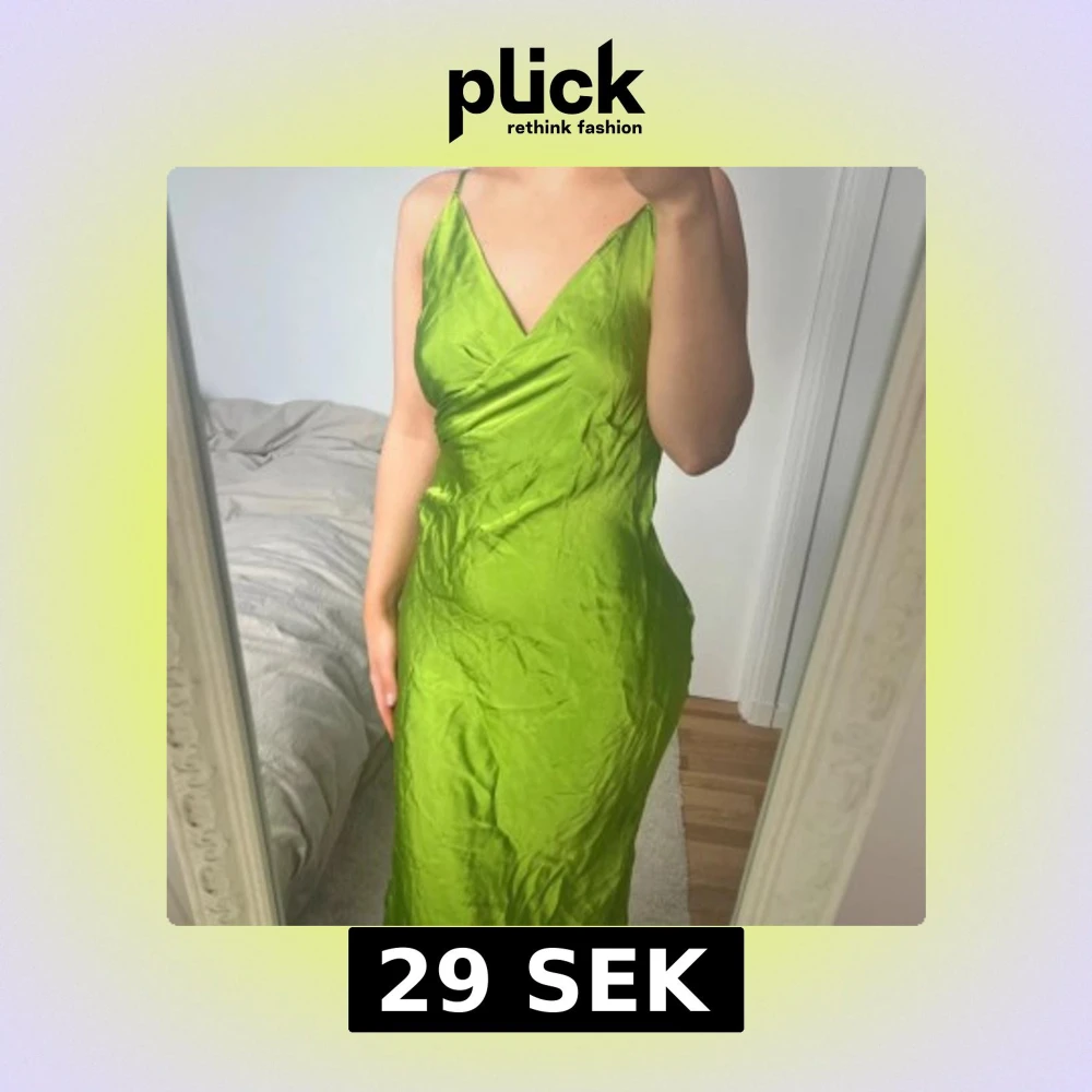 Säljer en snygg grön långklänning från Zara med omlott-v-ringning och tunna axelband. Klänningen har en figurnära passform och är gjord i ett glansigt, silkigt material som ger en lyxig känsla. Perfekt för dig som vill sticka ut med färg och stil 💚