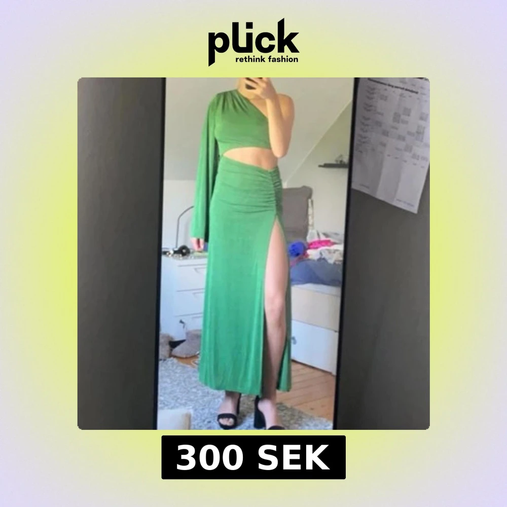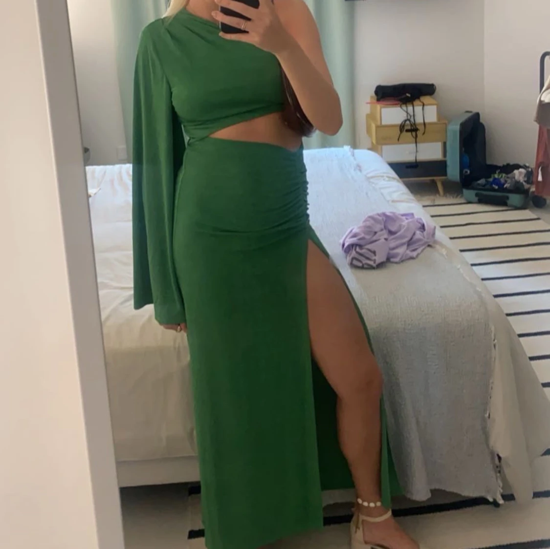 Snygg grön långklänning med en ärm och oneshoulder-design. Klänningen har en hög slits på ena sidan och en tight passform upptill med rynkade detaljer vid höften. Perfekt för dig som vill sticka ut med en unik och trendig look.