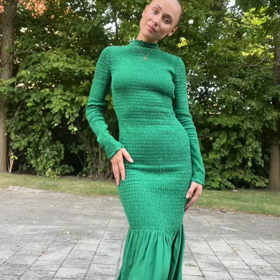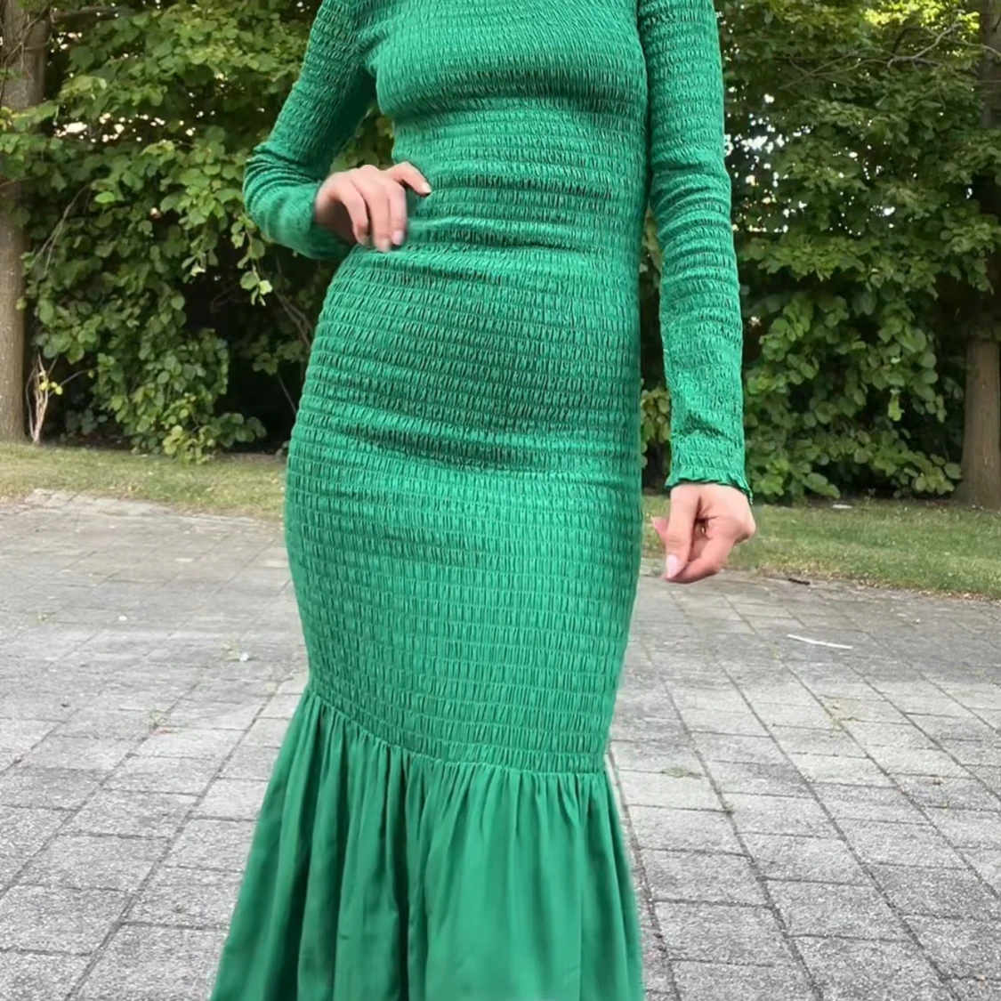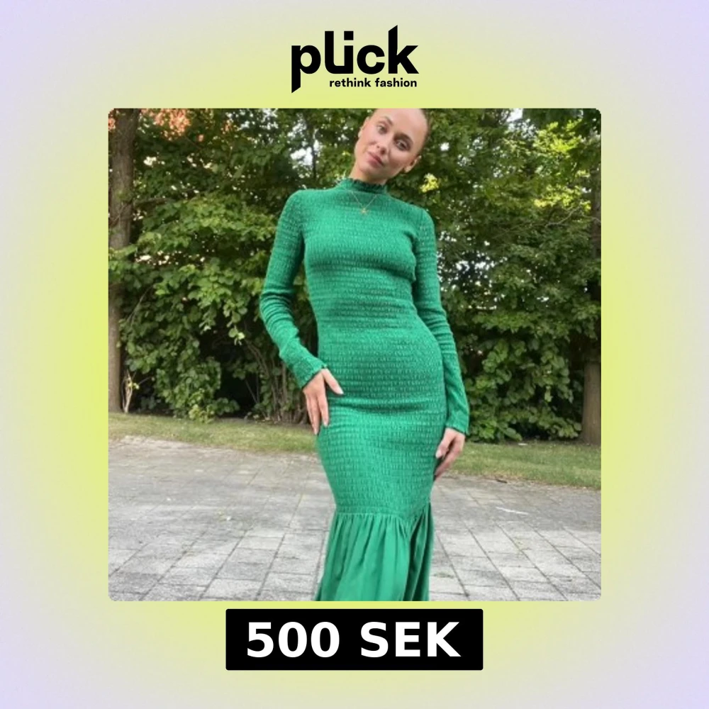 Säljer en snygg grön långklänning med smockad överdel och lång ärm. Klänningen har en volang nertill som ger extra rörelse och en tight passform upptill. Perfekt för dig som vill sticka ut med färg!