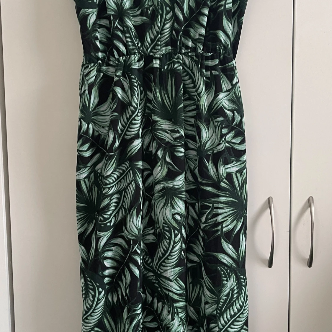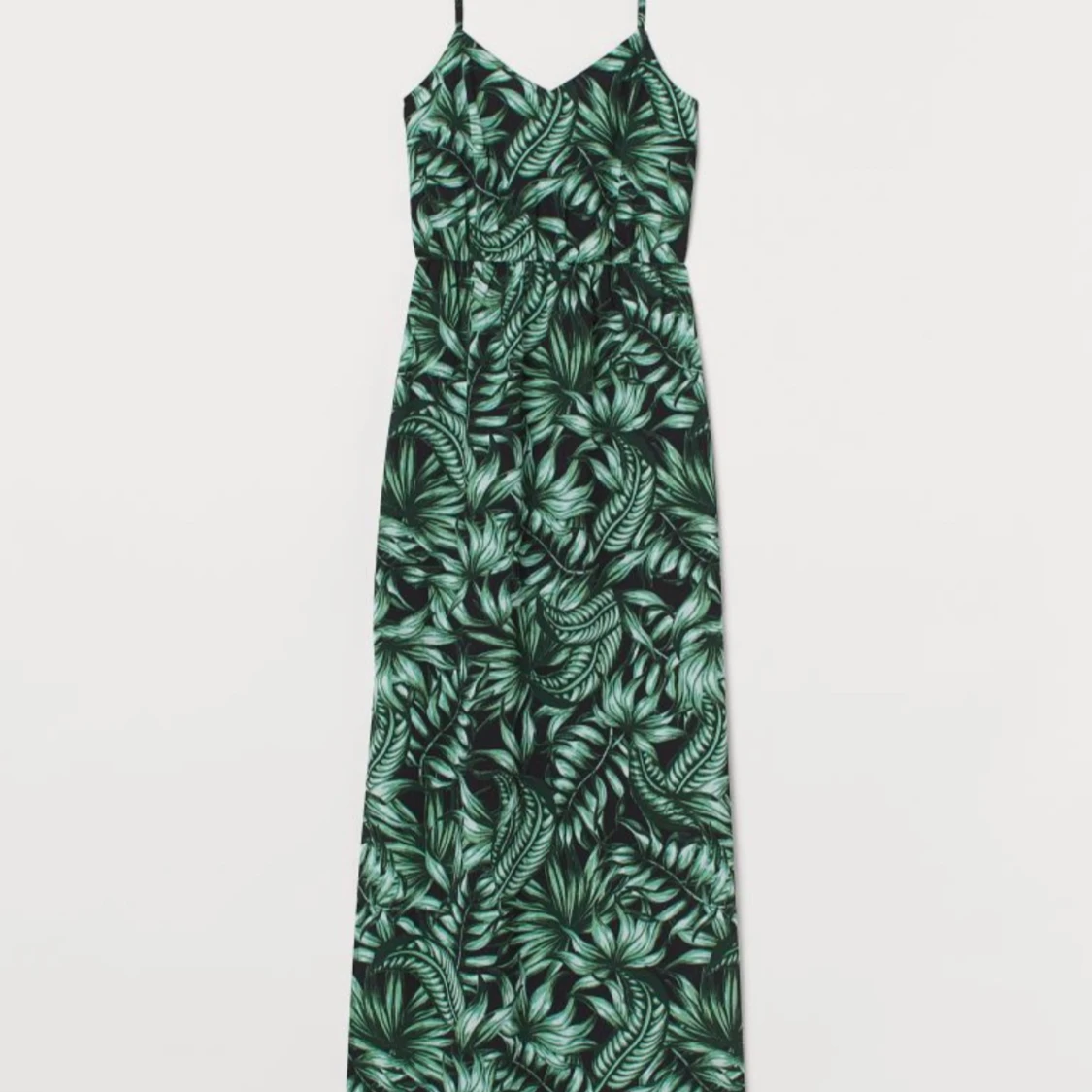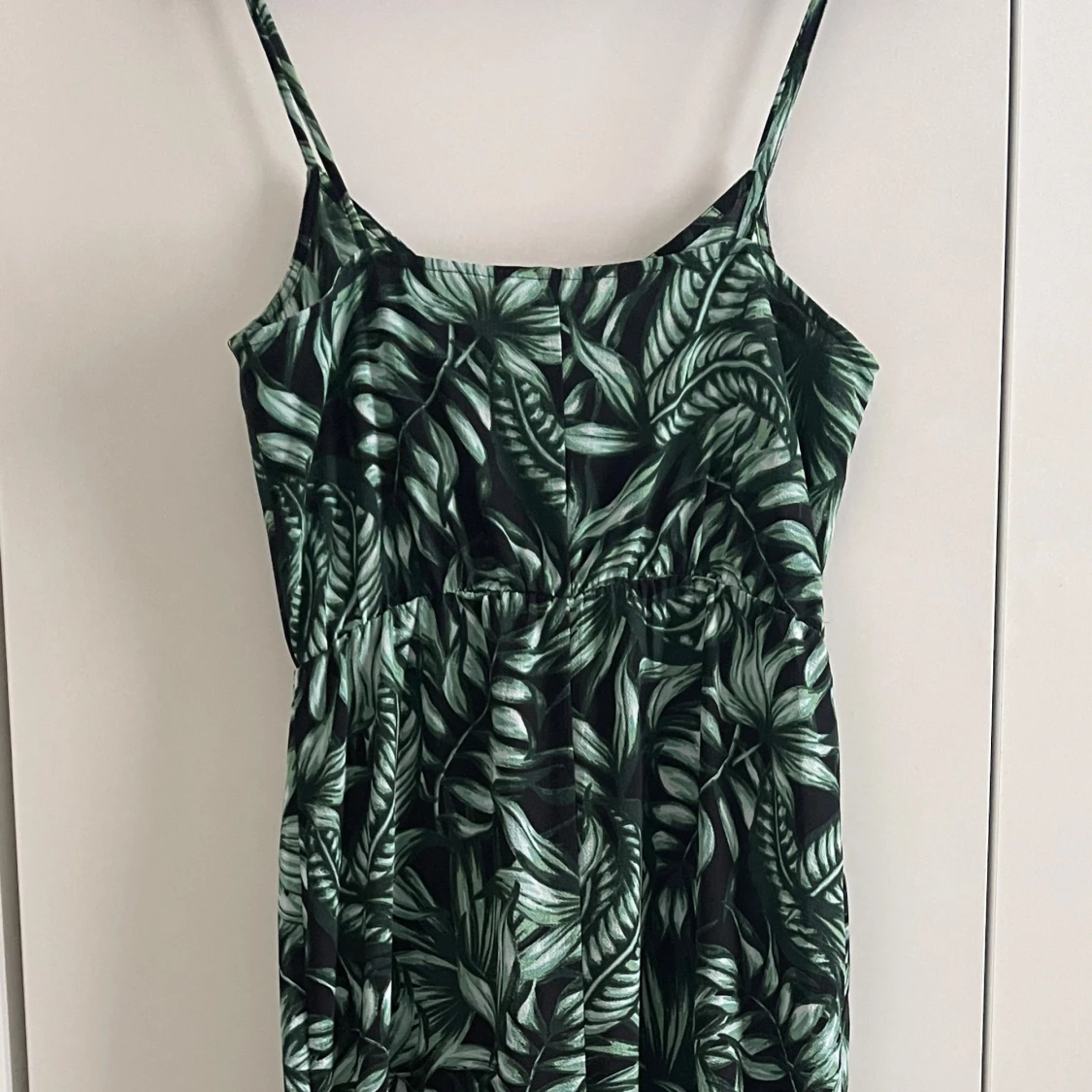 Snygg långklänning med grönt bladmotiv på svart bakgrund. Klänningen har smala axelband och en bekväm passform som passar perfekt för varma dagar. Perfekt för en somrig look!
