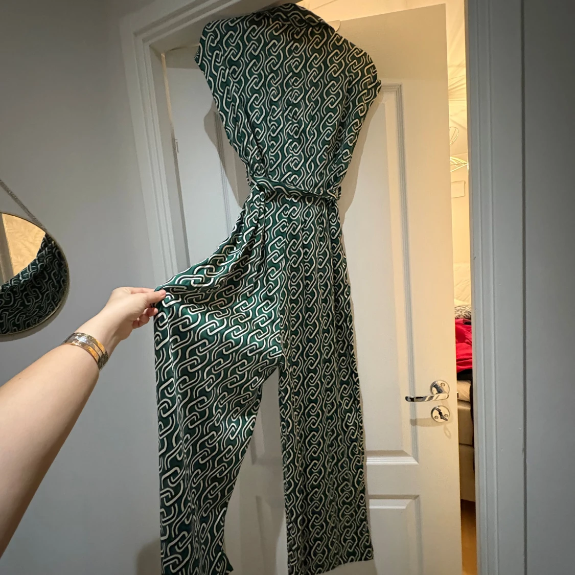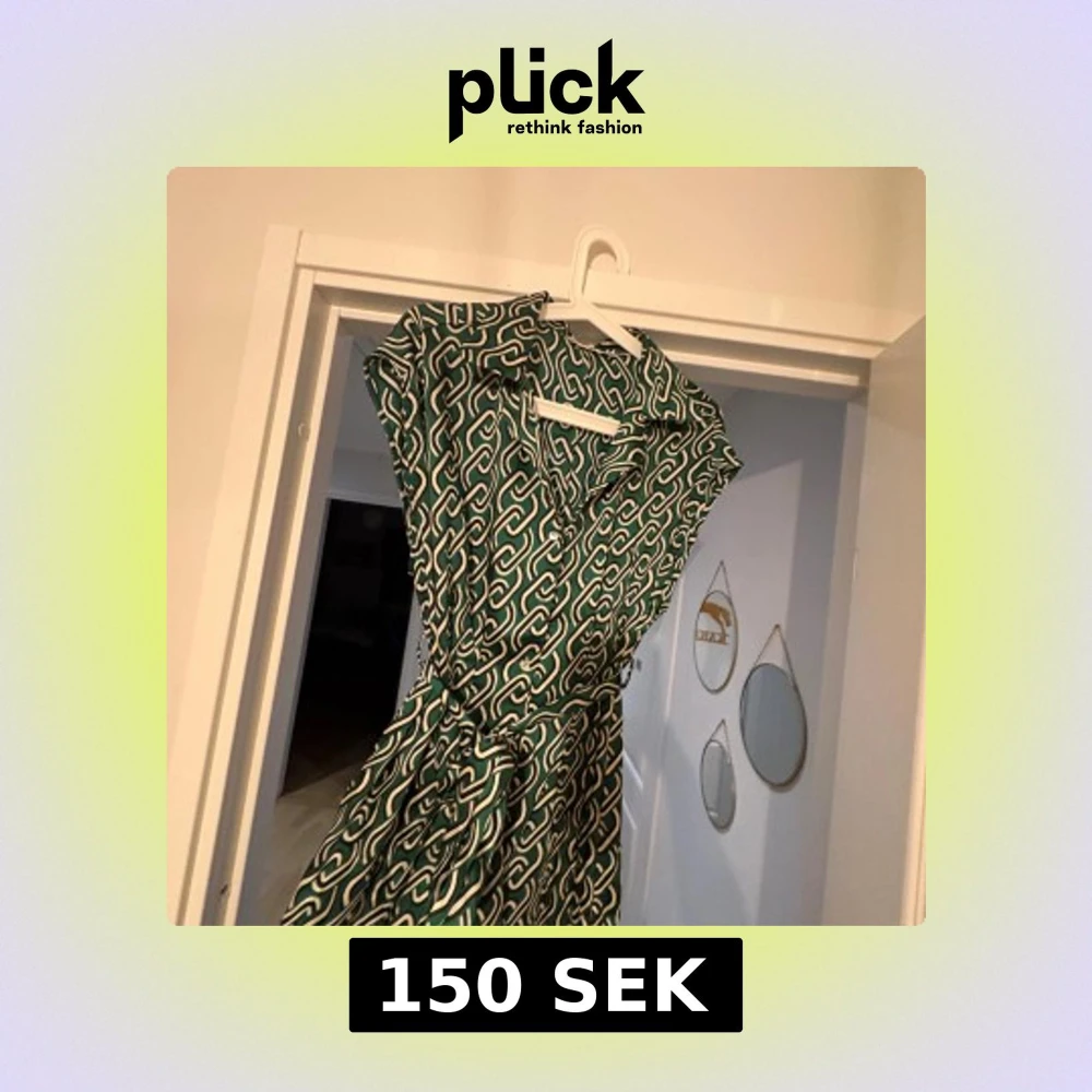 Snygg långklänning i grönt med vitt grafiskt mönster. Klänningen har omlottkänsla, knyt i midjan och korta ärmar. Materialet är mjukt och följsamt, perfekt för dig som gillar statement-plagg med coola detaljer.💚
