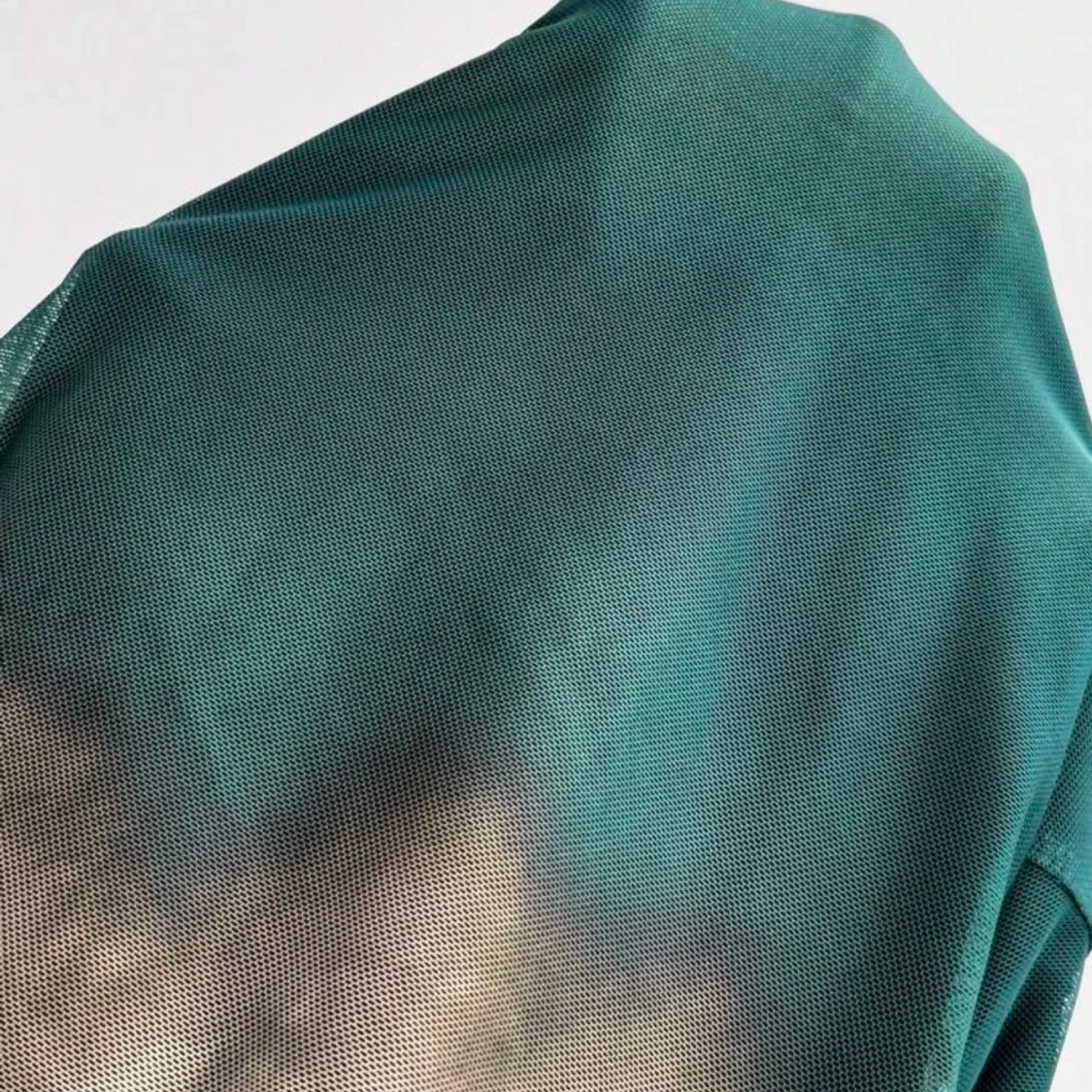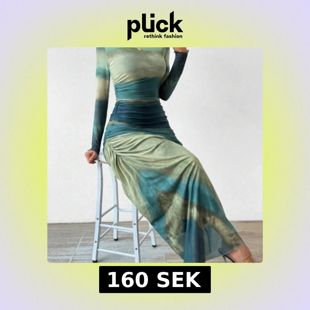 Snygg långklänning i gröna och blå toner med ett unikt mönster. Klänningen har långa ärmar och en smickrande drapering i midjan som ger en elegant siluett. Perfekt för en stilfull look. Använd 1-2 gånger.