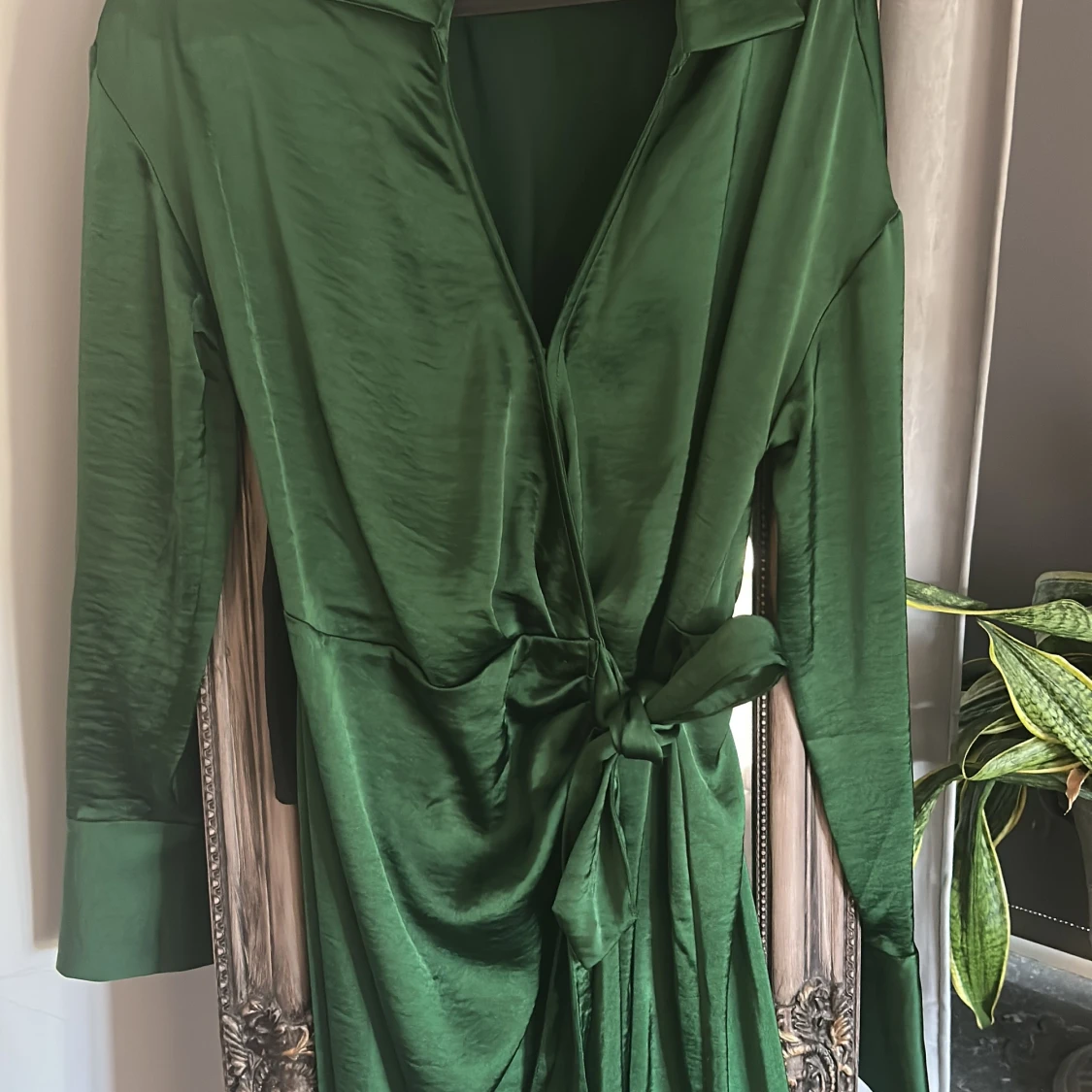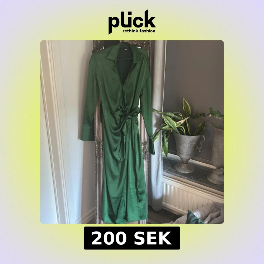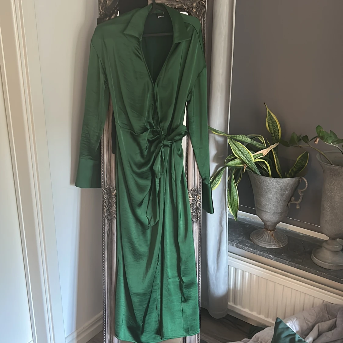Snygg lång grön omlottklänning från Gina Tricot i glansigt material. Klänningen har långa ärmar, breda manschetter, krage och knyt i midjan för en smickrande siluett. Perfekt för dig som vill sticka ut med en elegant look.