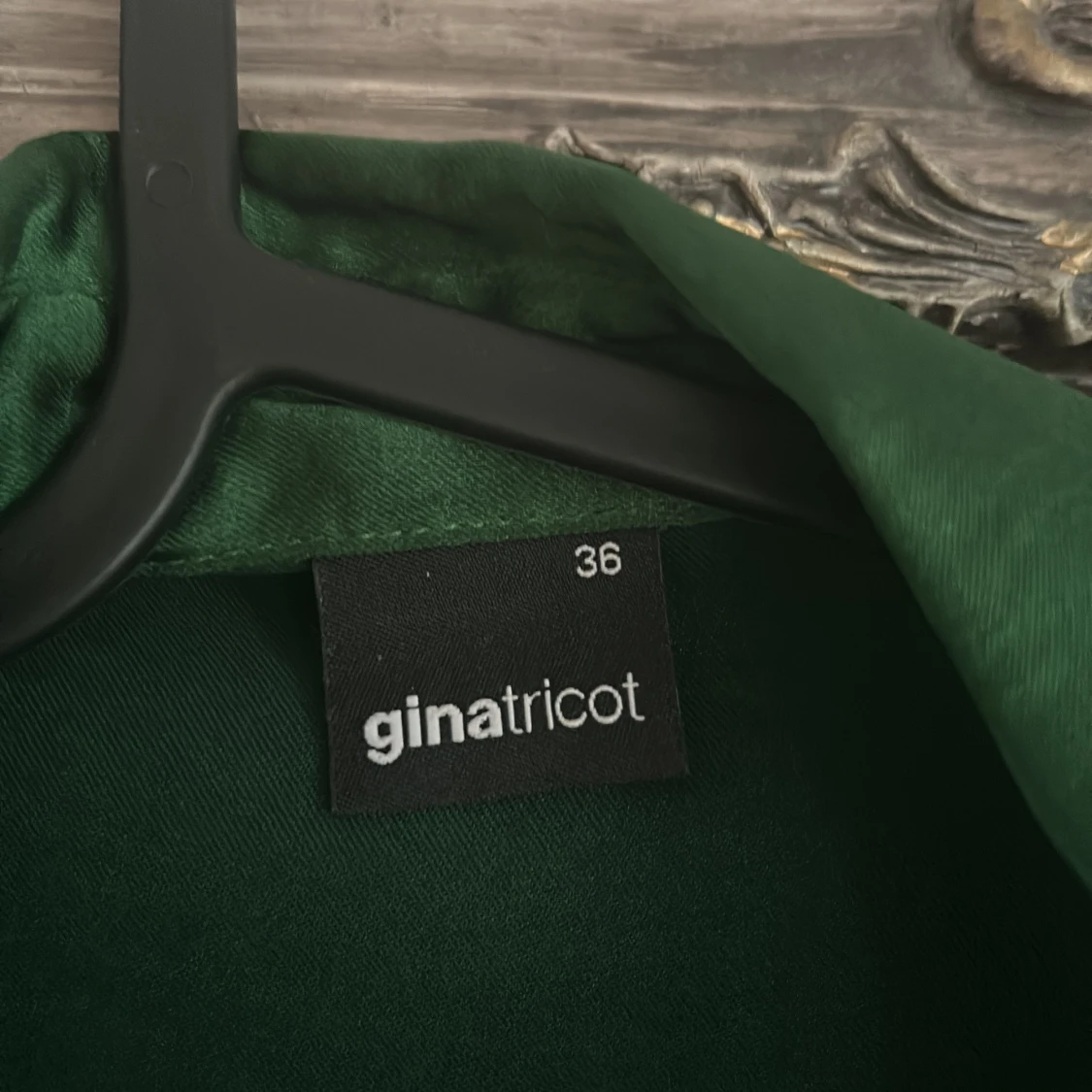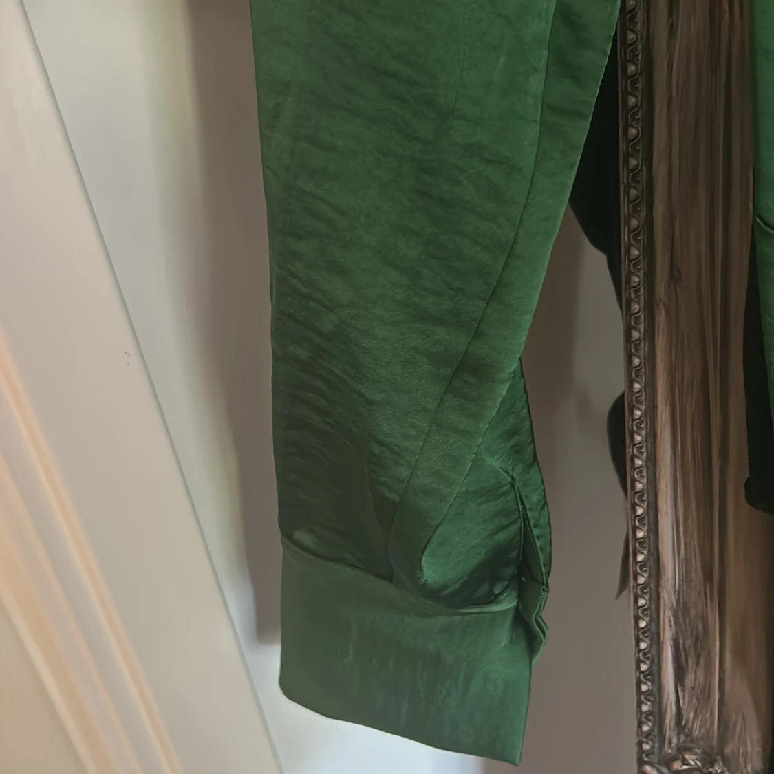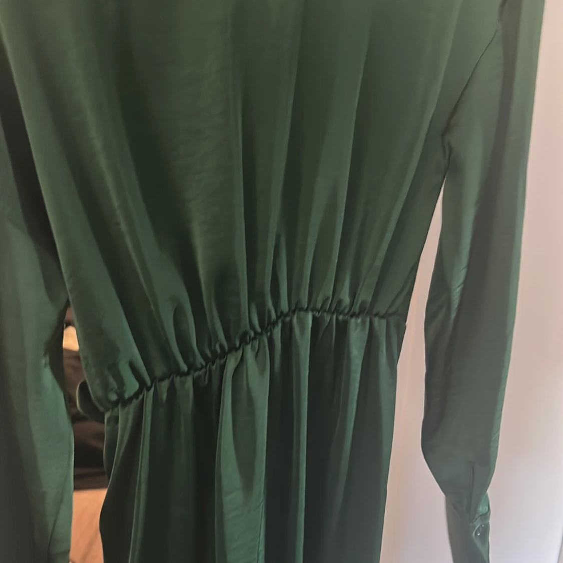 Snygg lång grön omlottklänning från Gina Tricot i glansigt material. Klänningen har långa ärmar, breda manschetter, krage och knyt i midjan för en smickrande siluett. Perfekt för dig som vill sticka ut med en elegant look.