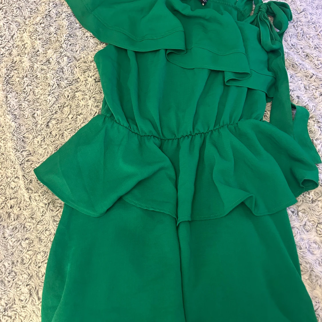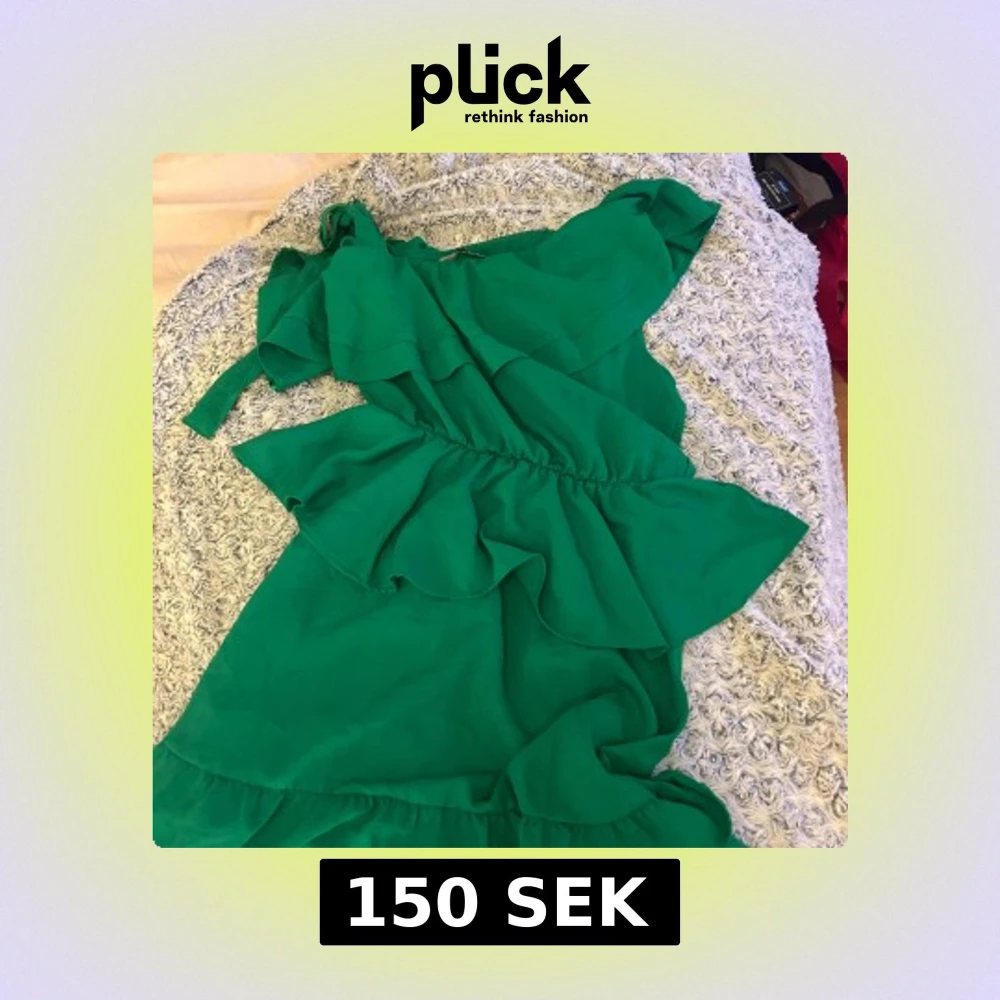 Superfin grön klänning med omlottkänsla och volangdetaljer. Klänningen har en axelbandslös design med knyt på ena axeln och markerad midja. Perfekt för dig som vill sticka ut med en färgstark look. Materialet känns lätt och passar bra till varmare dagar.