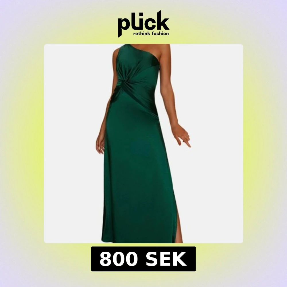 Elegant grön långklänning i satin med oneshoulder-design och en stilfull slits. Perfekt för en glamorös kväll, till exempel en skolbal