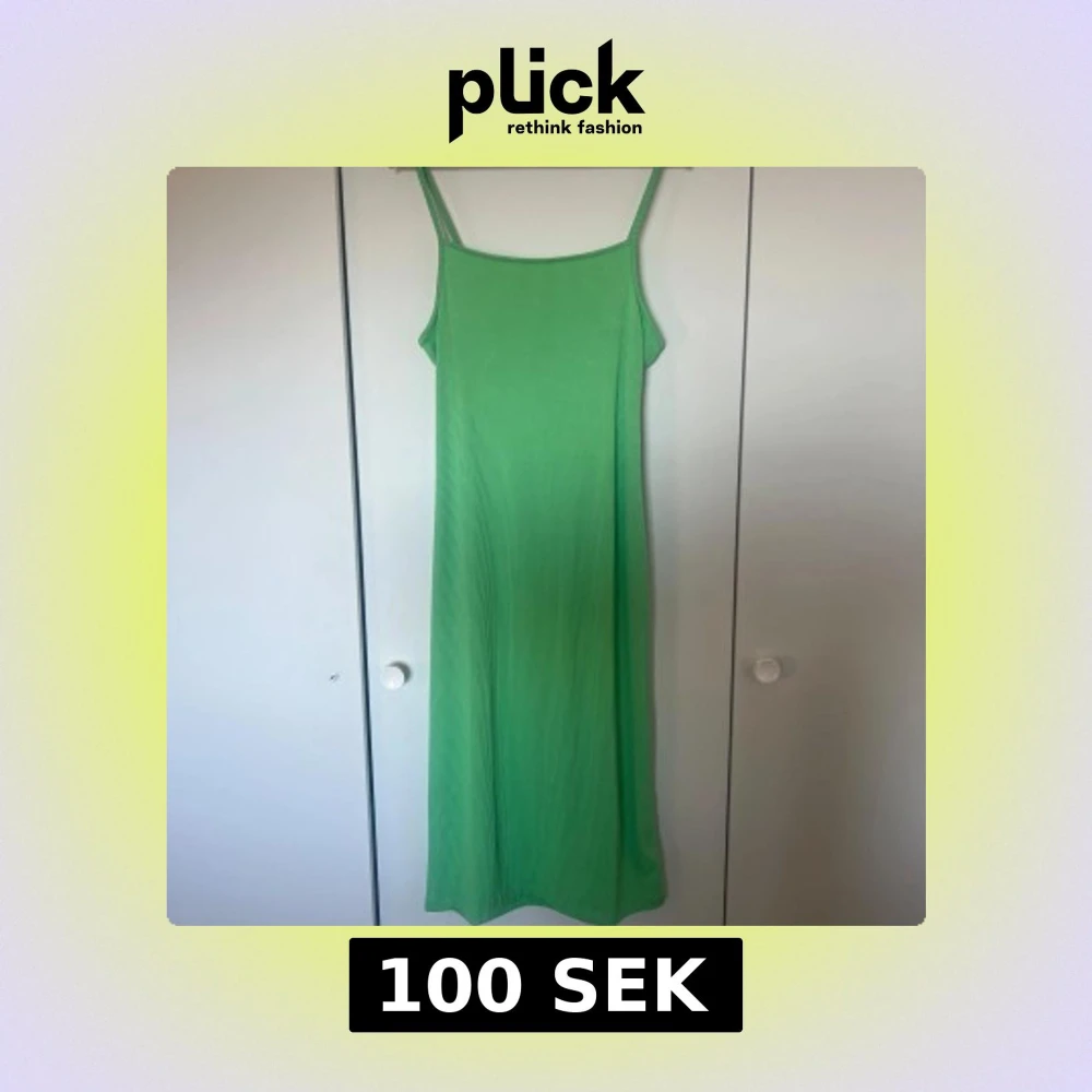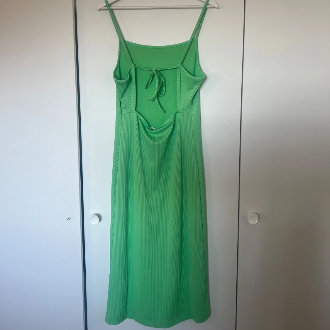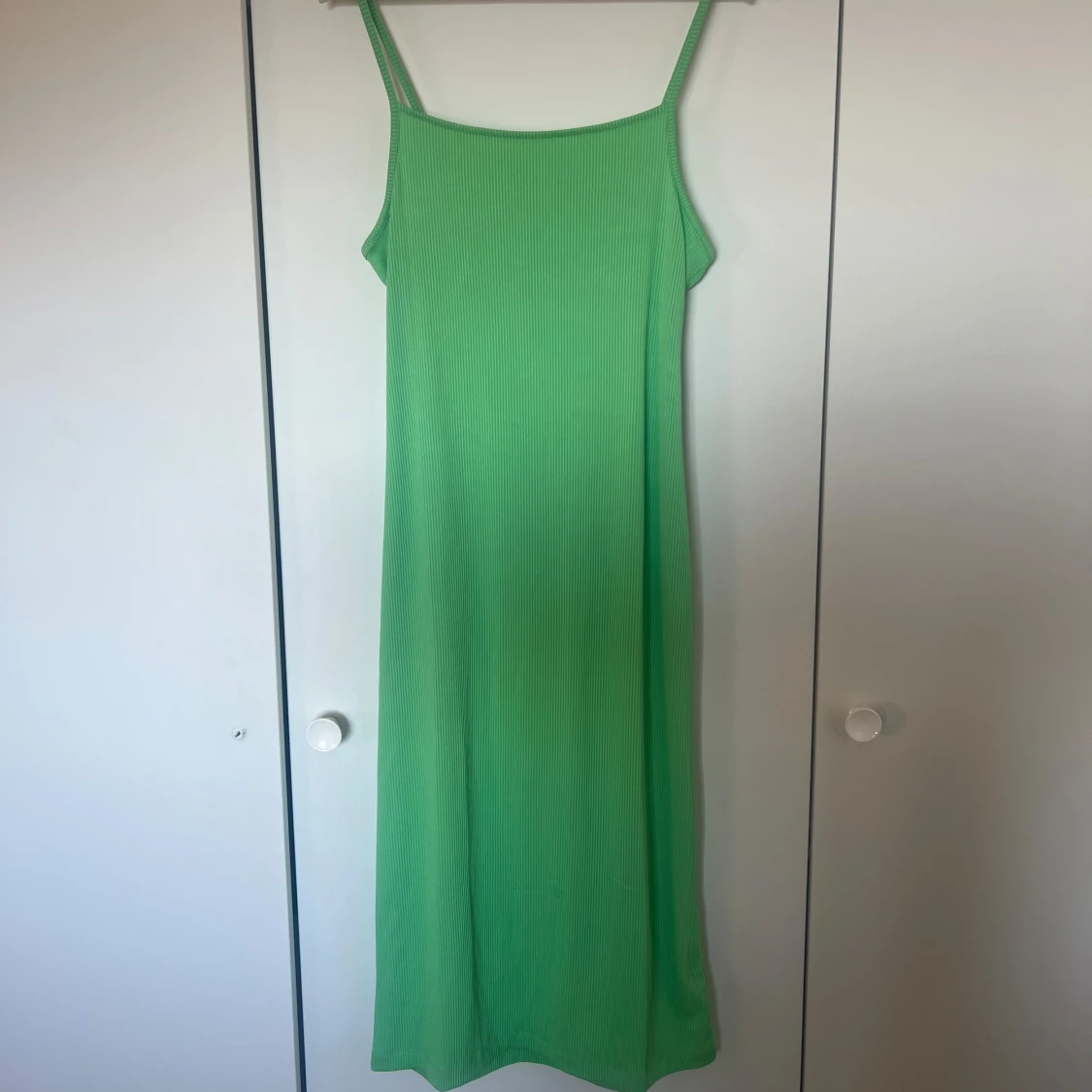 Snygg grön ribbad långklänning med smala axelband och knytning i ryggen. Perfekt för en somrig dag. Klänningen har en enkel och stilren design.