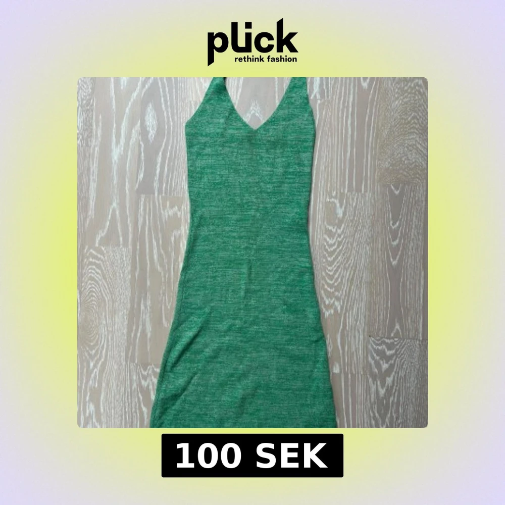Snygg grön stickad klänning med v-ringad hals och smala axelband som korsas i ryggen. Klänningen har en tight passform och är perfekt för dig som gillar en enkel men trendig stil.