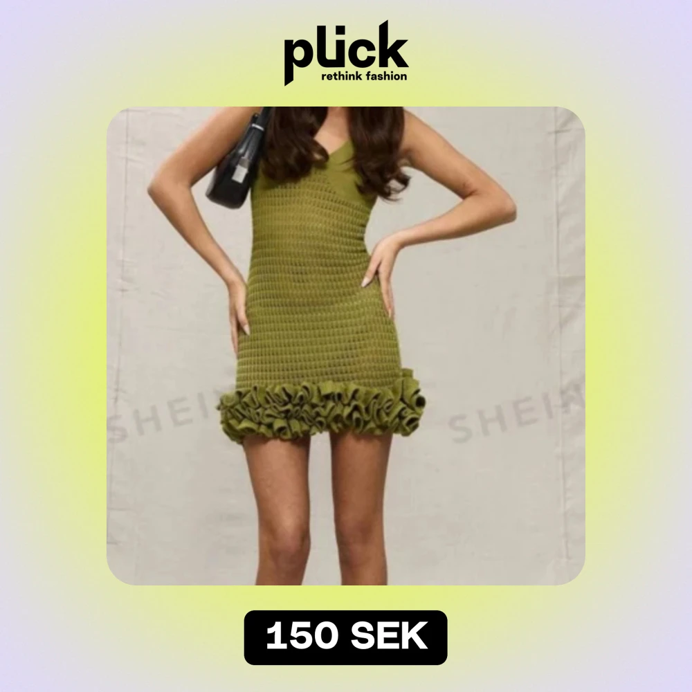 Säljer en superfin grön stickad klänning med volangdetaljer längst ner. Klänningen är ärmlös och har en tight passform som framhäver figuren. Perfekt för sommarens alla fester! 💚