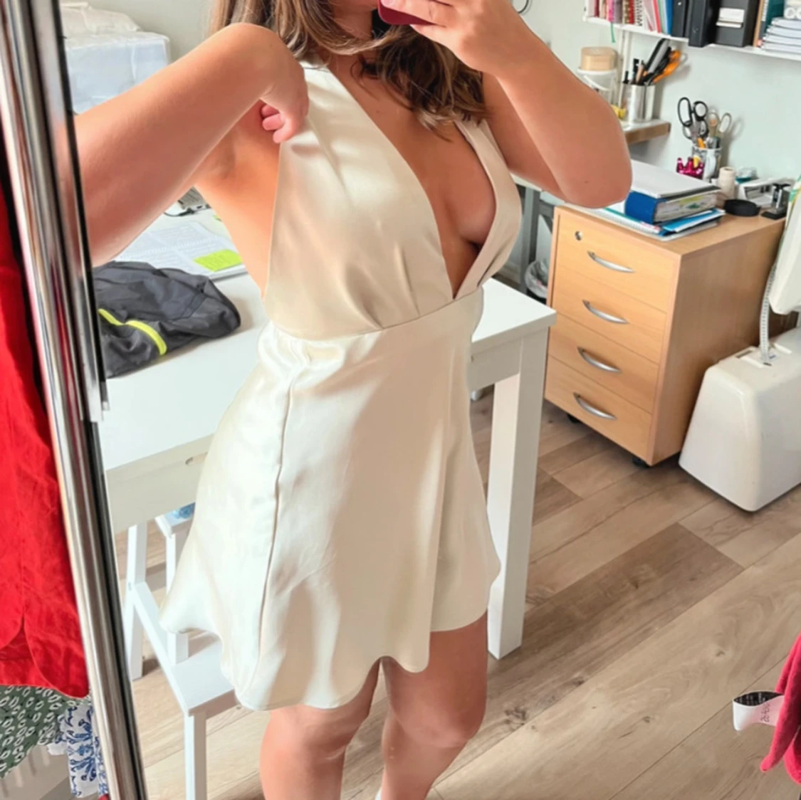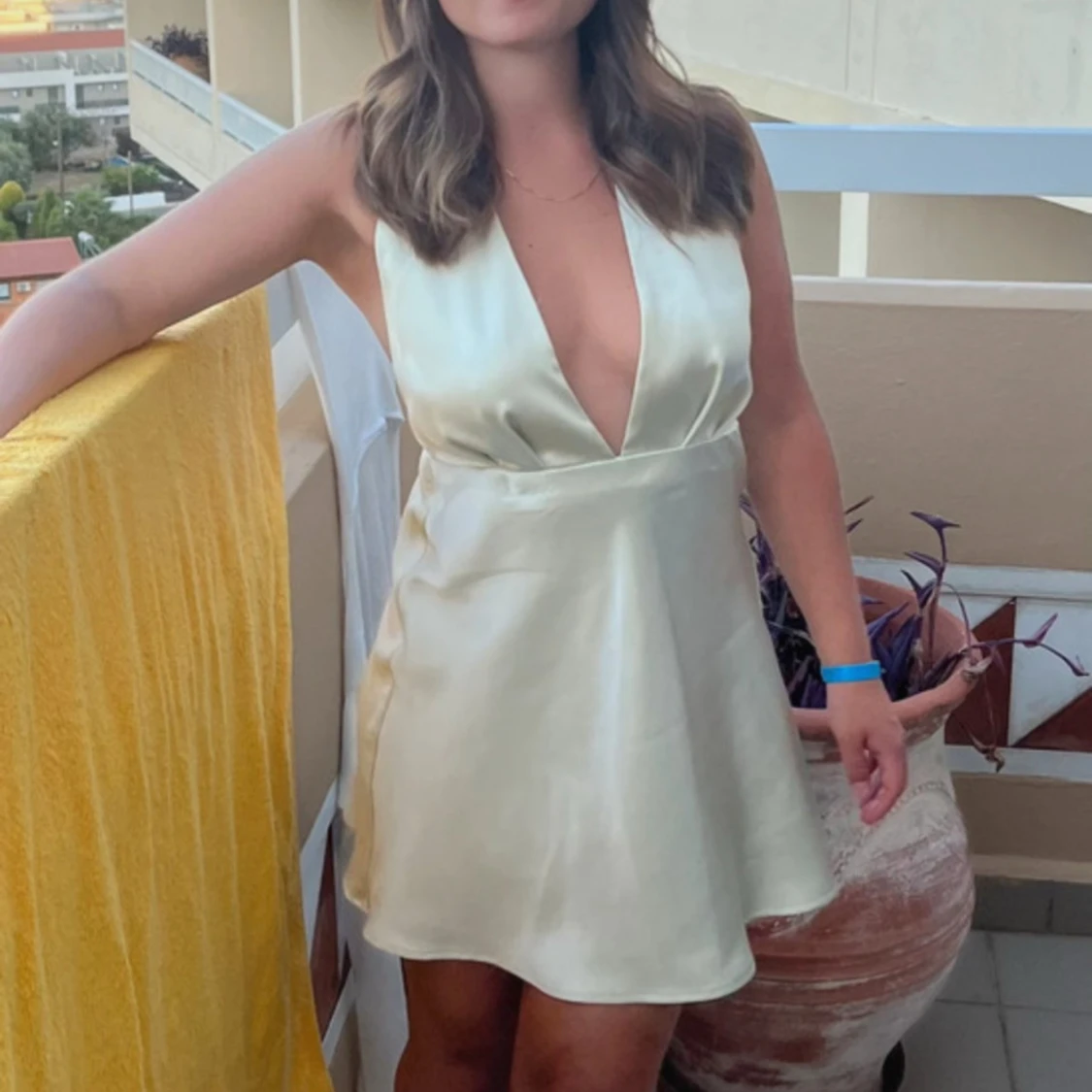 Jättefin halterneck klänning i satin. Med öppen rygg.