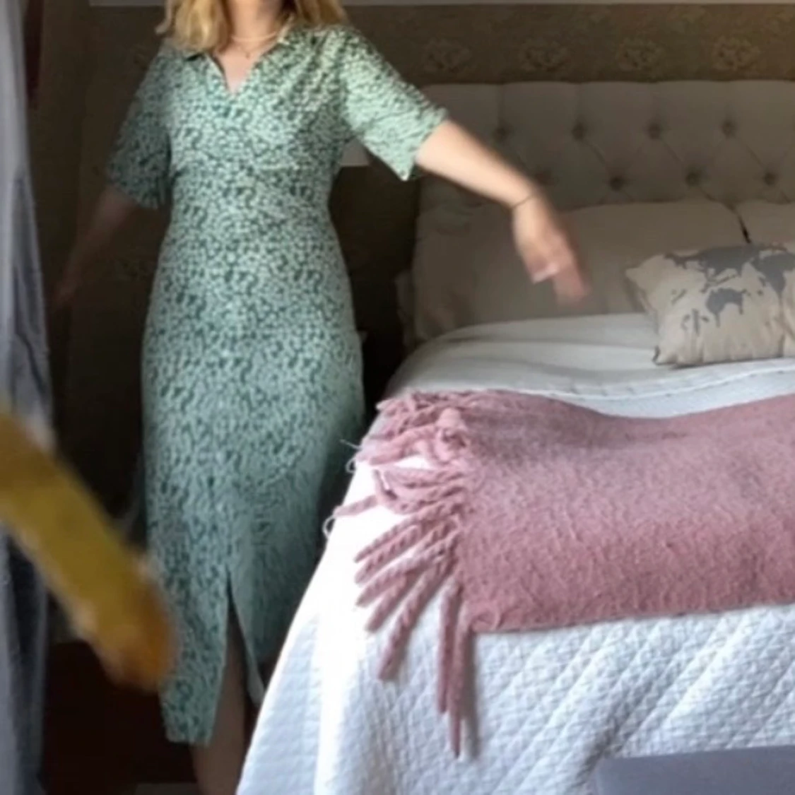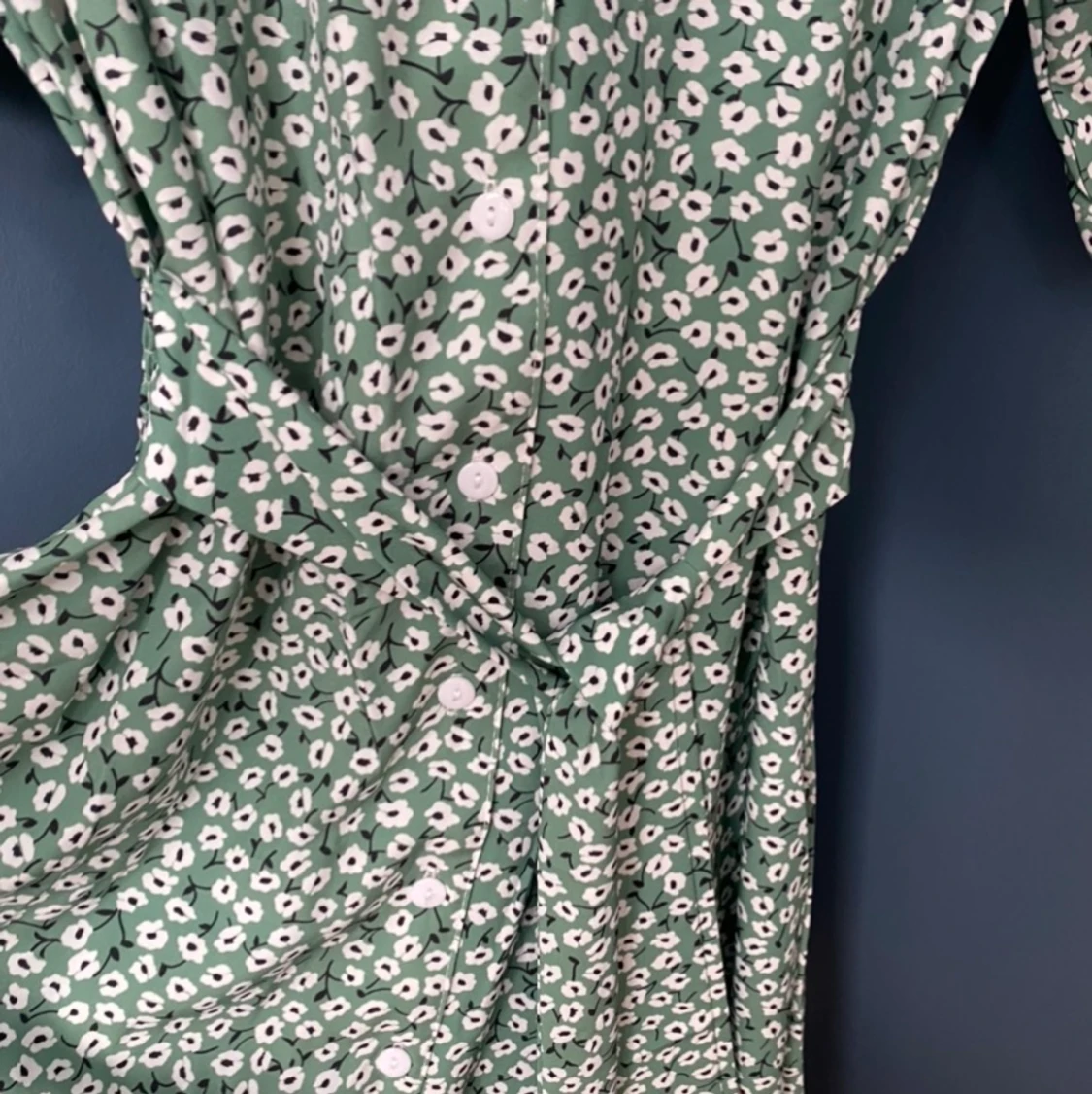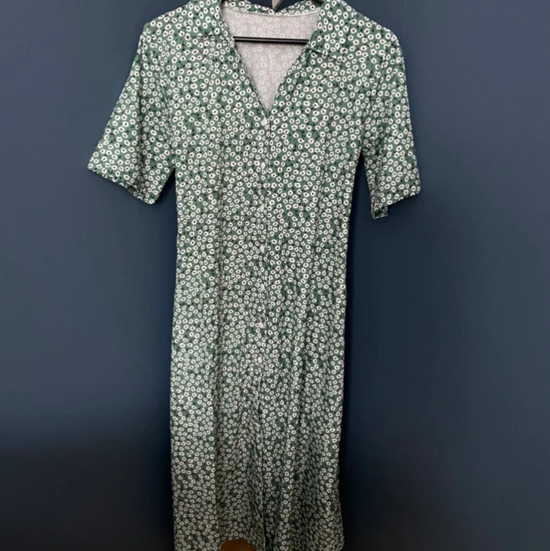 Supersöt midi-klänning! 💚 på mig som är 162 räcker den till mina vader ungefär (bild 3) Den har en krage runt halsen, och man kan knyta bandet både fram och i ryggen.
