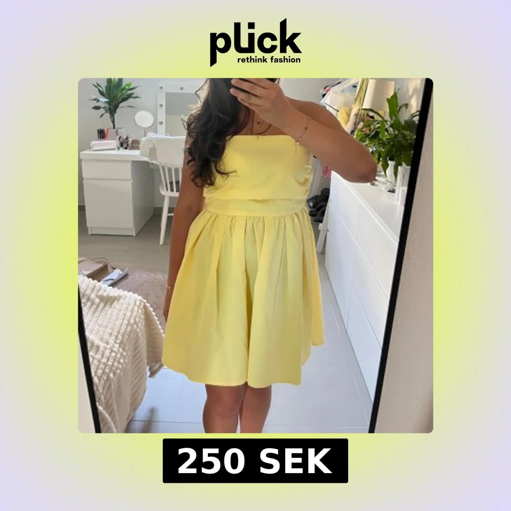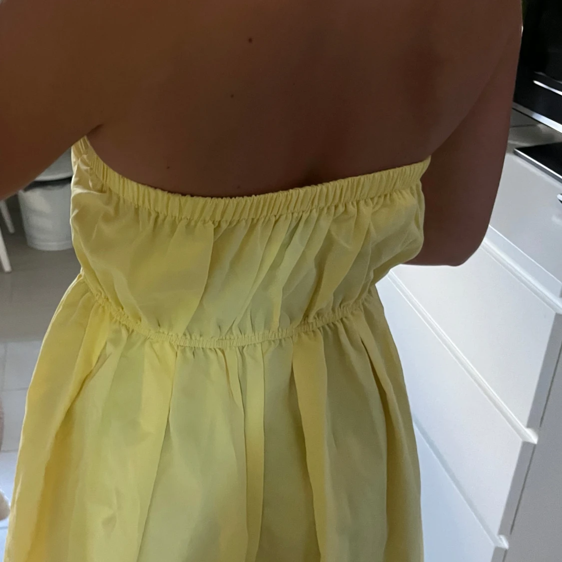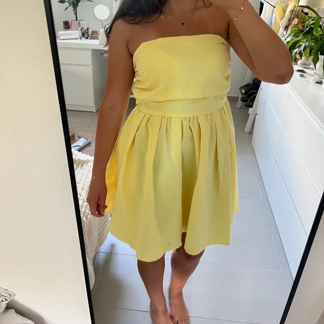 Superfin gul axelbandslös kortklänning med voluminös kjol och smockad rygg. Perfekt för dig som vill ha en söt och somrig look. Klänningen har en enkel, stilren design och är lätt att matcha med accessoarer. Storlek M men passar oxå S och L eftersom den har resor på baksidan. Använd en gång.