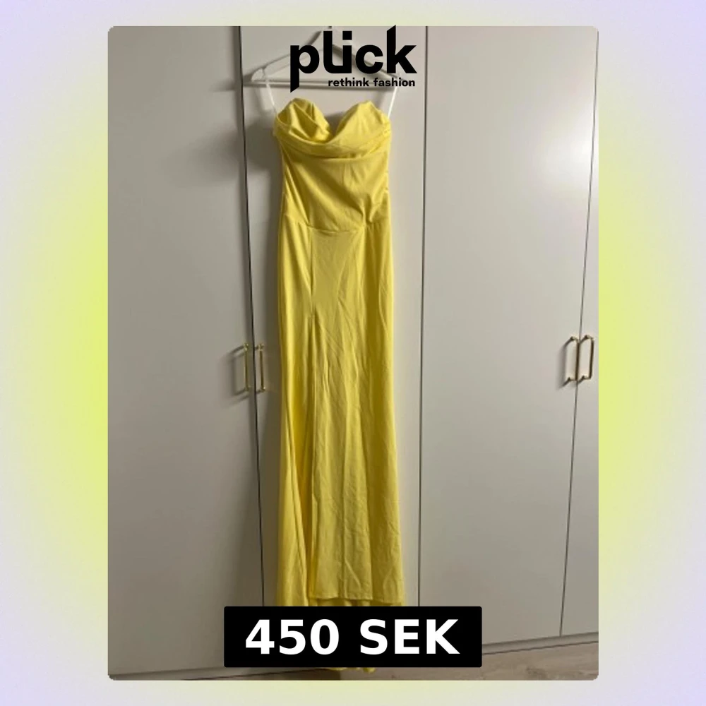 Snygg gul långklänning med axelbandslös design och draperad överdel. Klänningen har en elegant och smickrande siluett som faller mjukt längs kroppen. Perfekt för dig som vill sticka ut med en färgstark look. Materialet känns lätt och bekvämt mot huden.
